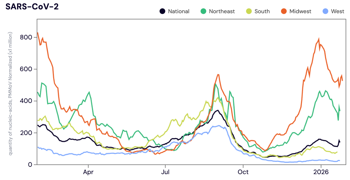 SARS-CoV-2 N gene RNA was detected in ~92% of samples in January 2026. The median SARS-CoV-2 concentration across all sites in January 2026 was 27,834 copies/gram. The median SARS-CoV-2 concentration in January 2026 was up ~24% compared to December 2025. While SARS-CoV-2 concentrations are low in the West, we are continuing to see elevated concentrations across the Midwest and Northeast regions. We will continue to monitor these trends as we move through the winter months.