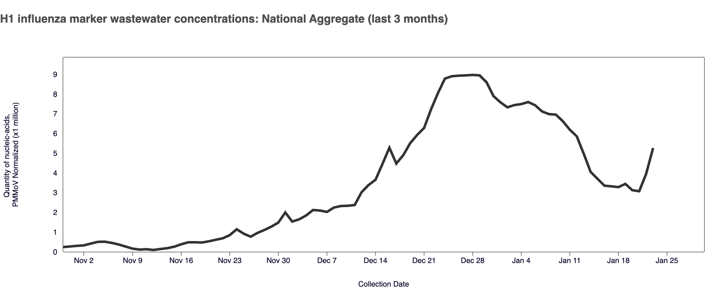 H1 Marker in Influenza A (IAV) The H1 marker in influenza A has been detected in ~35% of samples in January 2026. The H1 median concentration across all sites in January 2026 was below the limit of detection. You can find a heat map of positive H1 detections here. This flu season were are seeing very low detections of the H1 influenza marker compared to the H3 influenza marker.