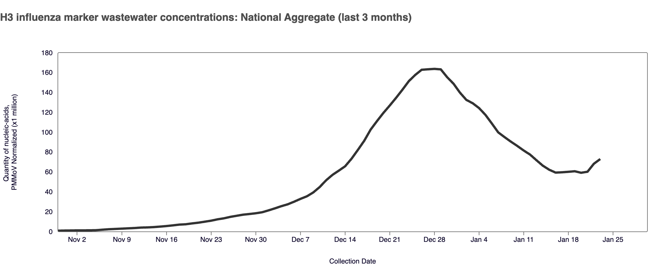 H3 Marker in Influenza A (IAV) In January 2026, the H3 marker in influenza A was detected in ~93% of samples. The H3 median concentration across all sites in January 2026 was 23,161 copies per gram. At many plants, H3 marker concentrations are increasingly driving the higher influenza A concentrations. A detection of H3 could include subclade K, a highly-mutated H3N2 variant currently spreading worldwide. You can find a heat map of positive H3 detections here.