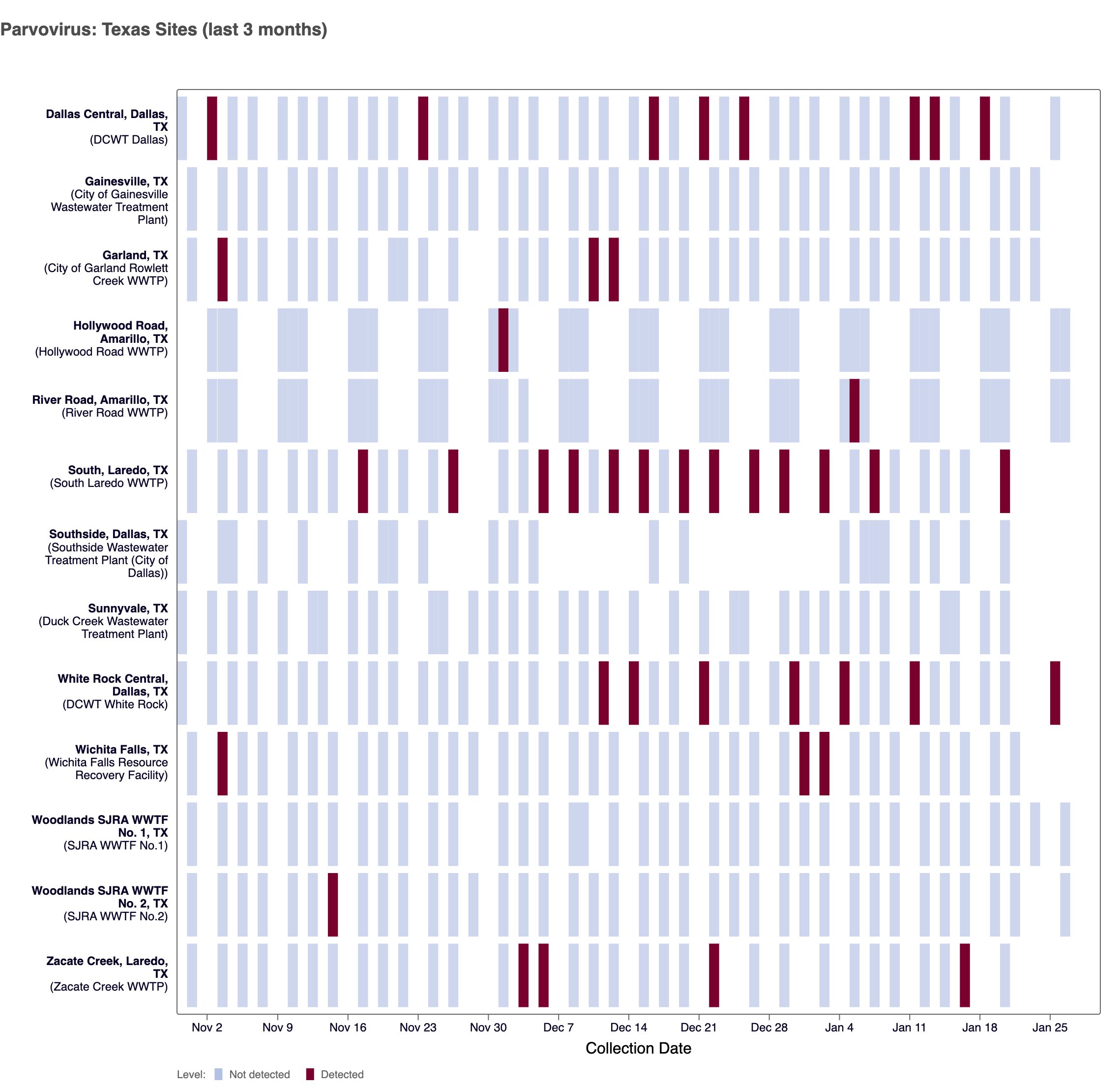 Parvovirus (Parvo) DNA - In mid May 2025, WWSCAN began prospectively monitoring for Parvovirus. Parvovirus B19 DNA was detected in ~25% of samples collected in January 2026 across WWSCAN sites.