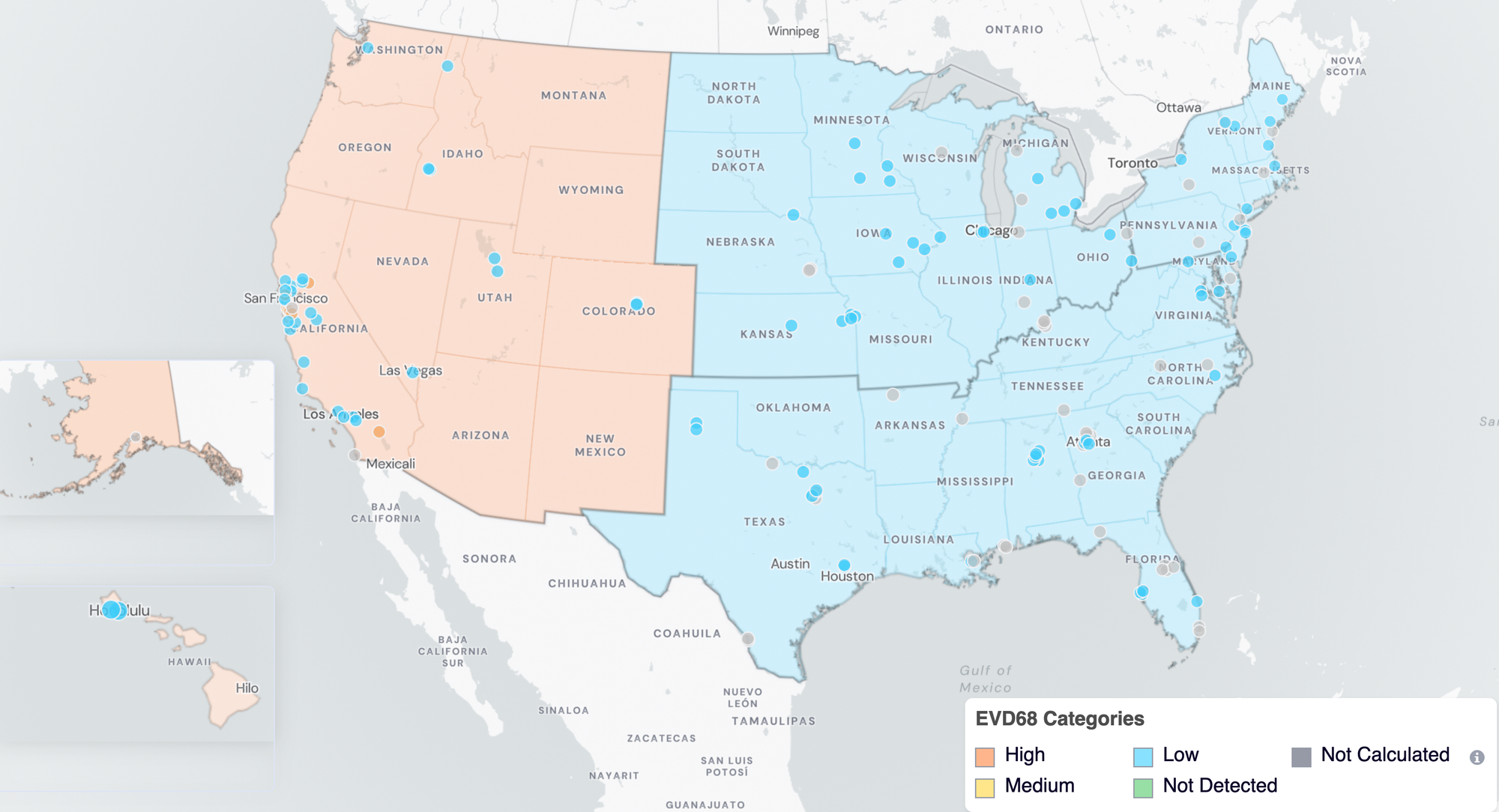 Nationally, EV-D68 is in the 'LOW' Wastewater Category with >50% of sites in offset of EV-D68 in wastewater. However the West is in the 'HIGH' category, all of which are in California.