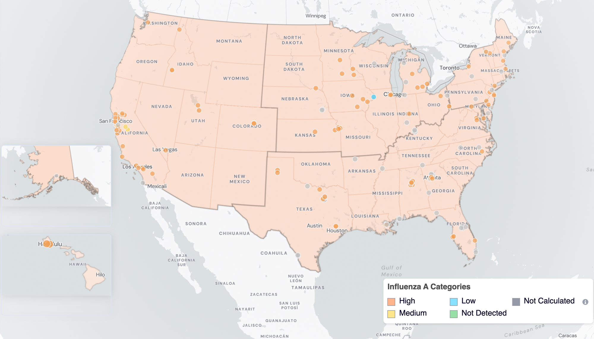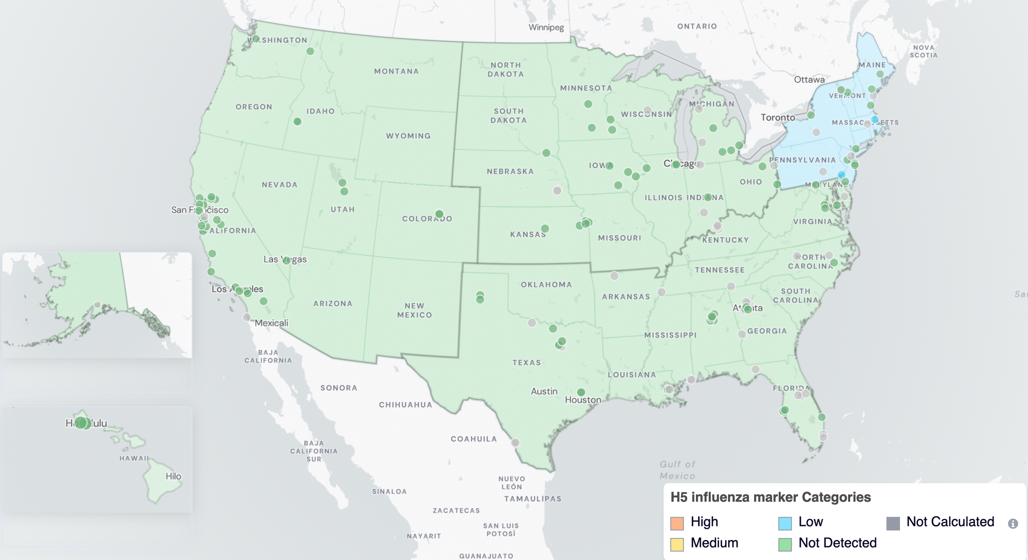 We recently started calculating a wastewater category for the H5 influenza marker. The H5 marker is now assigned to the 'Pathogens that are not commonly detected ' category logic. Nationally, the H5 influenza marker is in 'LOW' category due to limited detections (all recent detections have been in the Northeast).