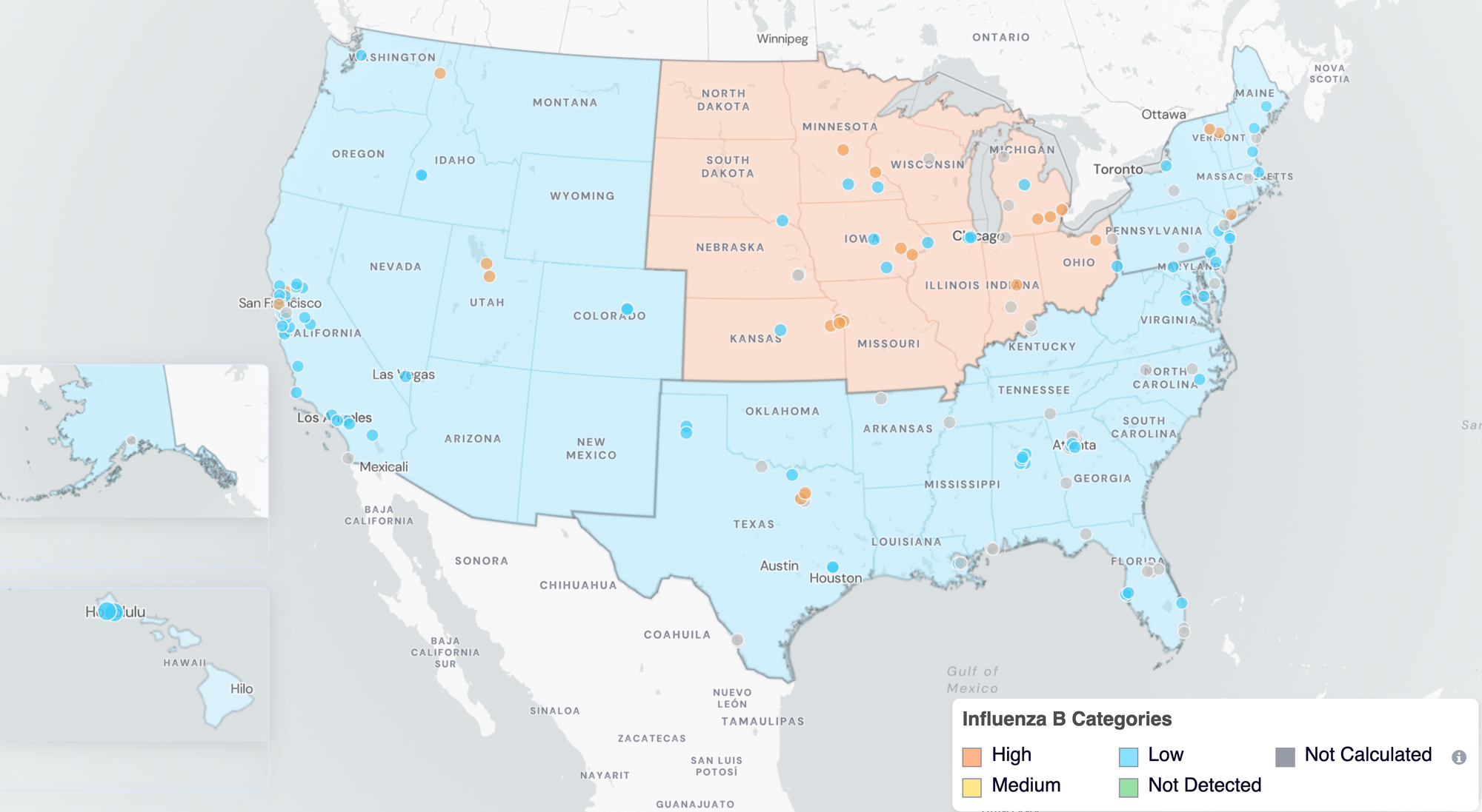Nationally, Influenza B is in the 'LOW' Wastewater Category due to >50% of sites being in offset for IBV in wastewater.