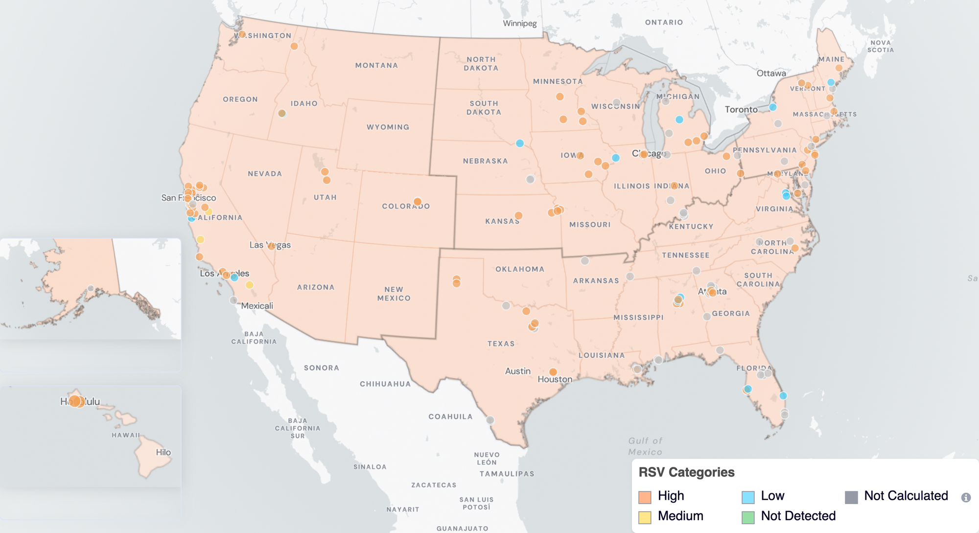 Nationally, RSV is in the 'HIGH' Wastewater Category with >50% of sites in seasonal onset for RSV in wastewater. We are seeing high concentrations and a downward trend for RSV in wastewater at the national level.