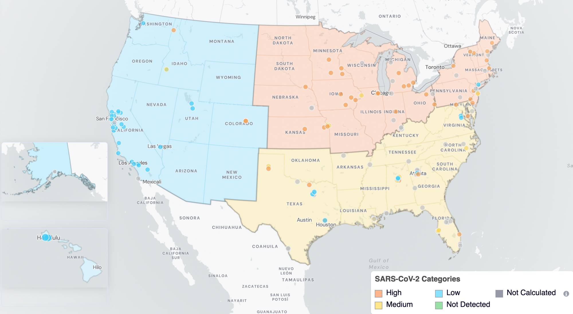 SARS-CoV-2 Wastewater Categories. This map includes sample collection data through January 28, 2026. Each dot represents a single site and the four US Census regions are outlined in gray. Midwest Region includes: IA, IL, IN, KS, MI, MN, NE, OH, SD, WI. Northeast Region includes: CT, MA, ME, NH, NJ, NY, PA, VT. Southern Region includes: AL, AR, DE, FL, GA, KY, LA, MD, MS, NC, TN, TX, VA, and WV. Western Region includes: AK, CA, CO, HI, ID, NV, UT, WA.