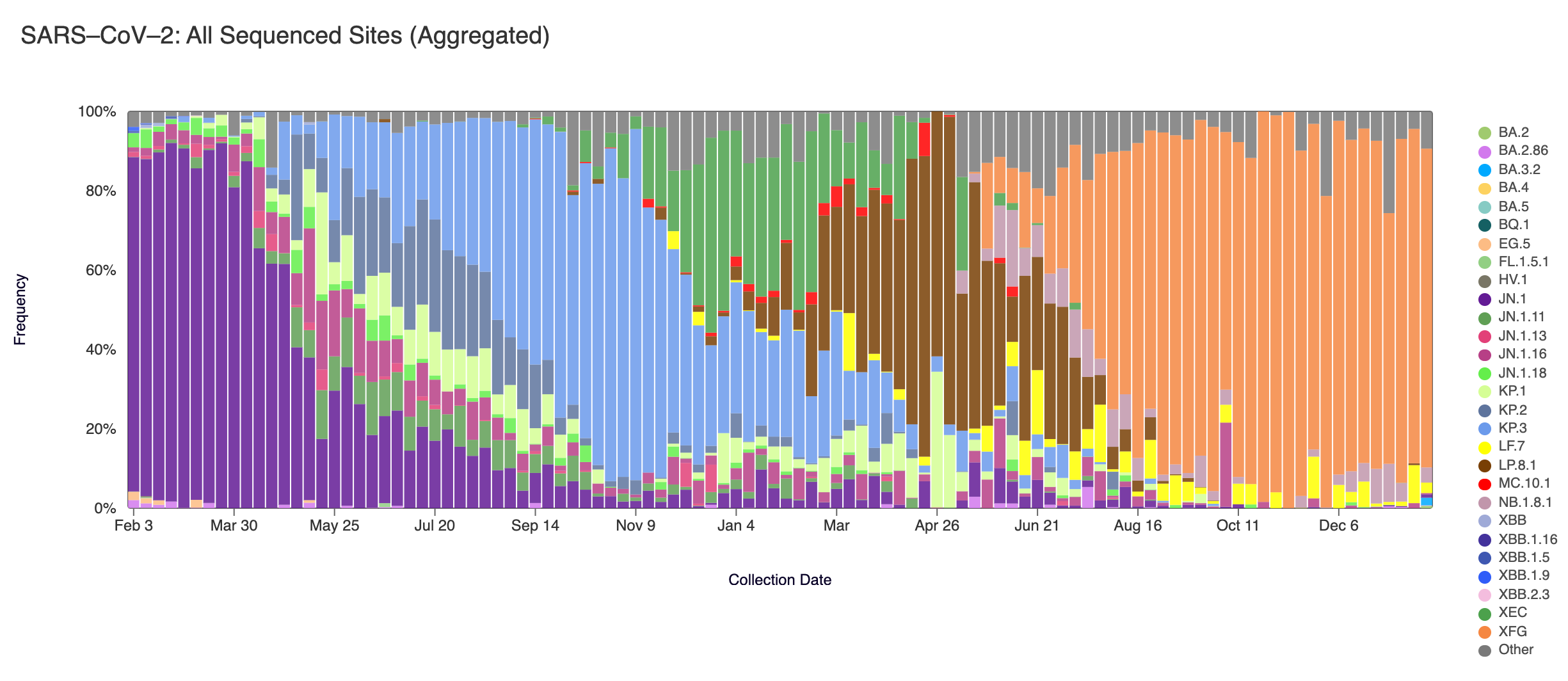 Sequencing data is also available in aggregate across all sites in WWSCAN with sequencing data. That plot is shown below and also suggests that XFG (shown in orange) is the most abundant variant across all sites at 80.3% followed by NB.1.8.1 (shown in mauve) at 3.8%.