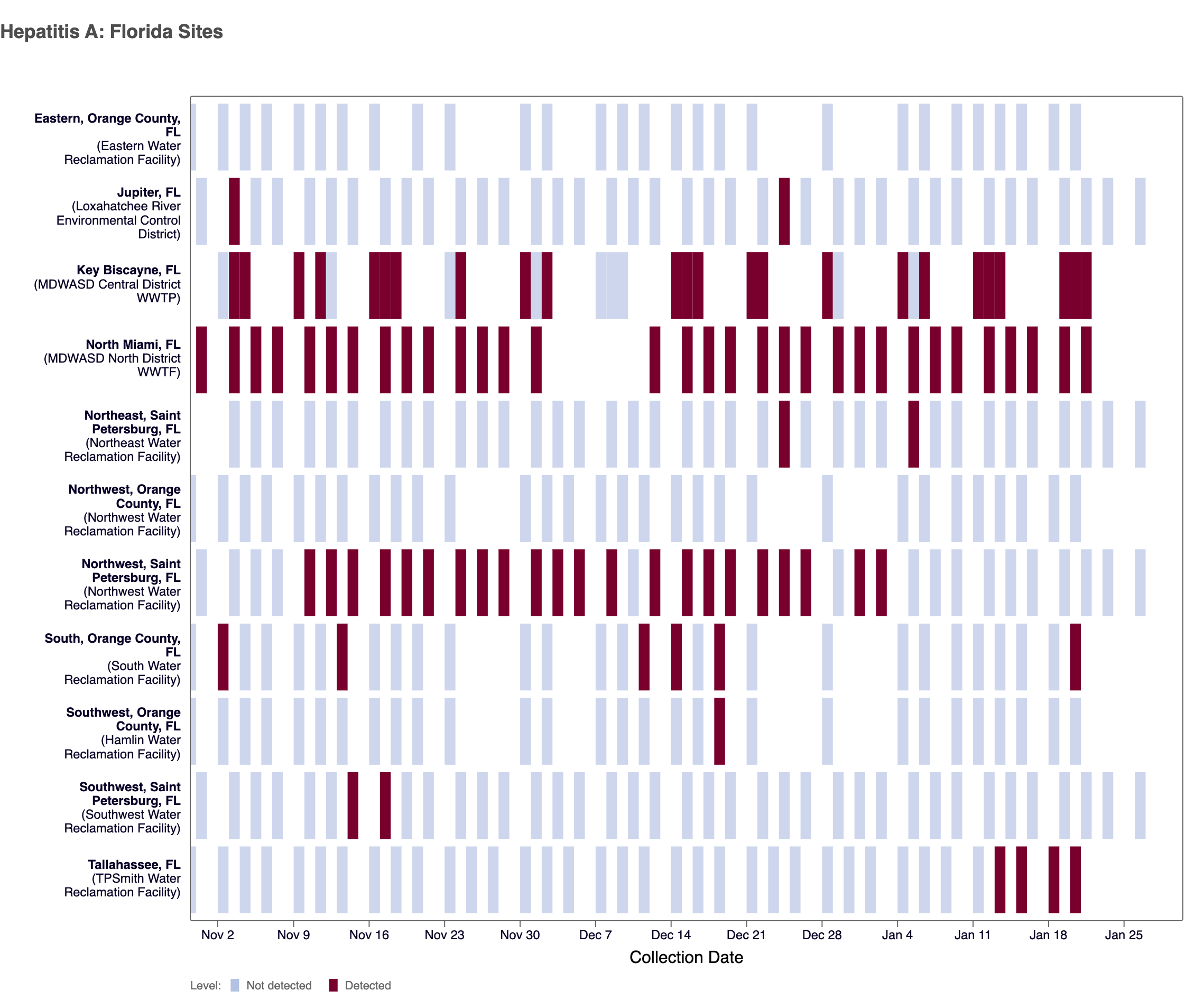The chart below shows each WWSCAN plant in Florida as rows, and days as columns (labeled at the bottom axis). White indicates no samples, blue is a non-detect for Hep A RNA and red is a detection for Hep A RNA. Evident in the plot below is some sites have consistent detections while others have few to no detections of HepA.