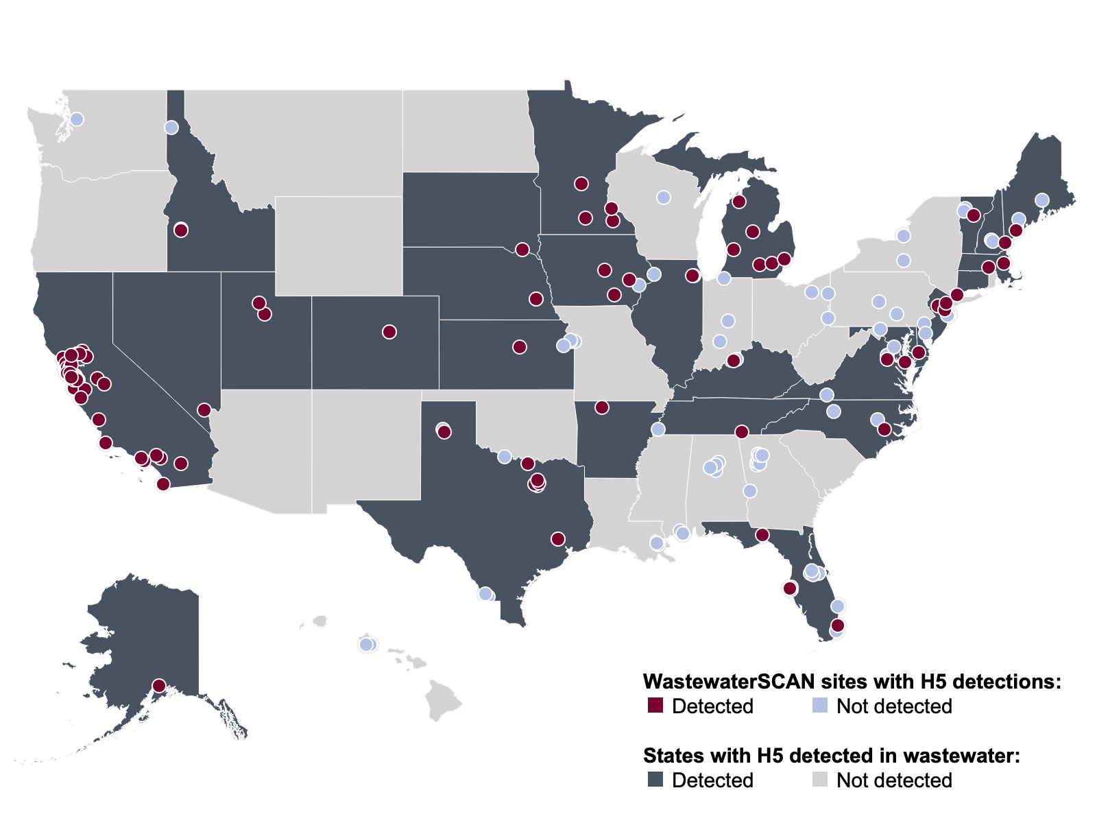 The WWSCAN program began monitoring for measles in wastewater start mid May 2025. This map only shows data from the sites/states that are covered by the WWSCAN program.