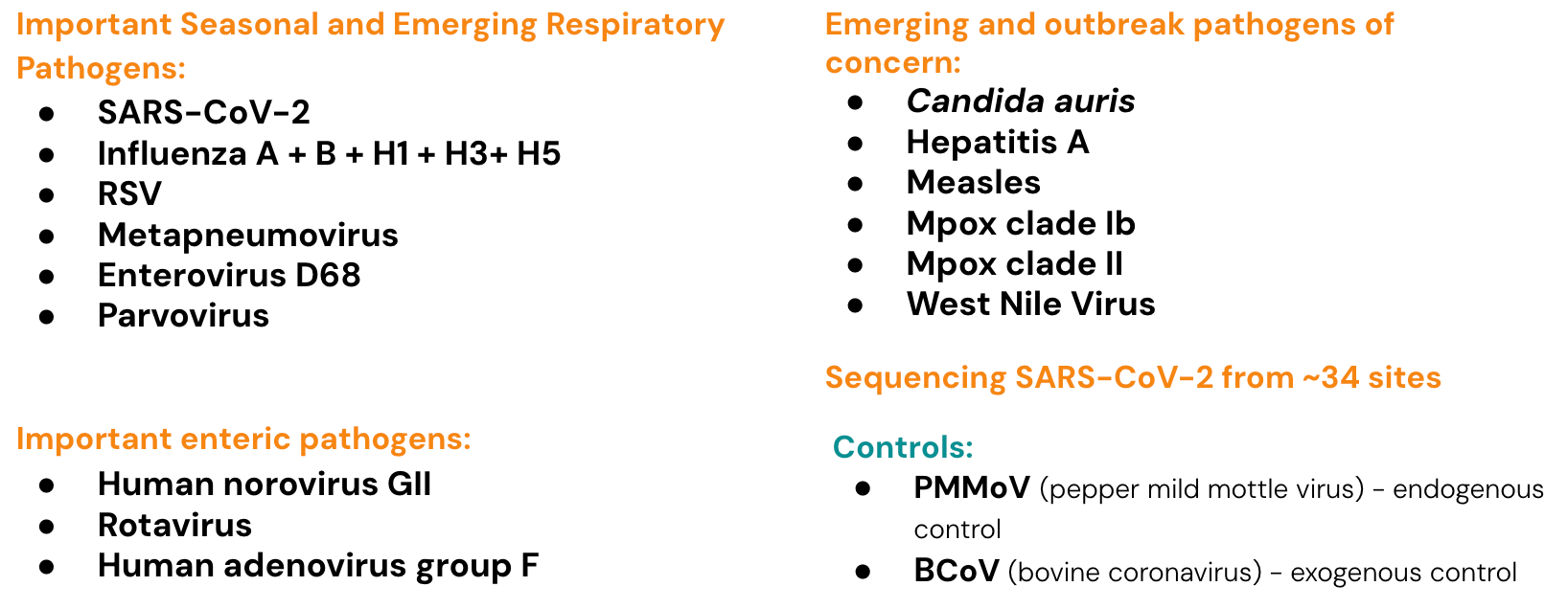 Currently monitoring a suite of Respiratory, Gastrointestinal and Outbreak Pathogens of Concern