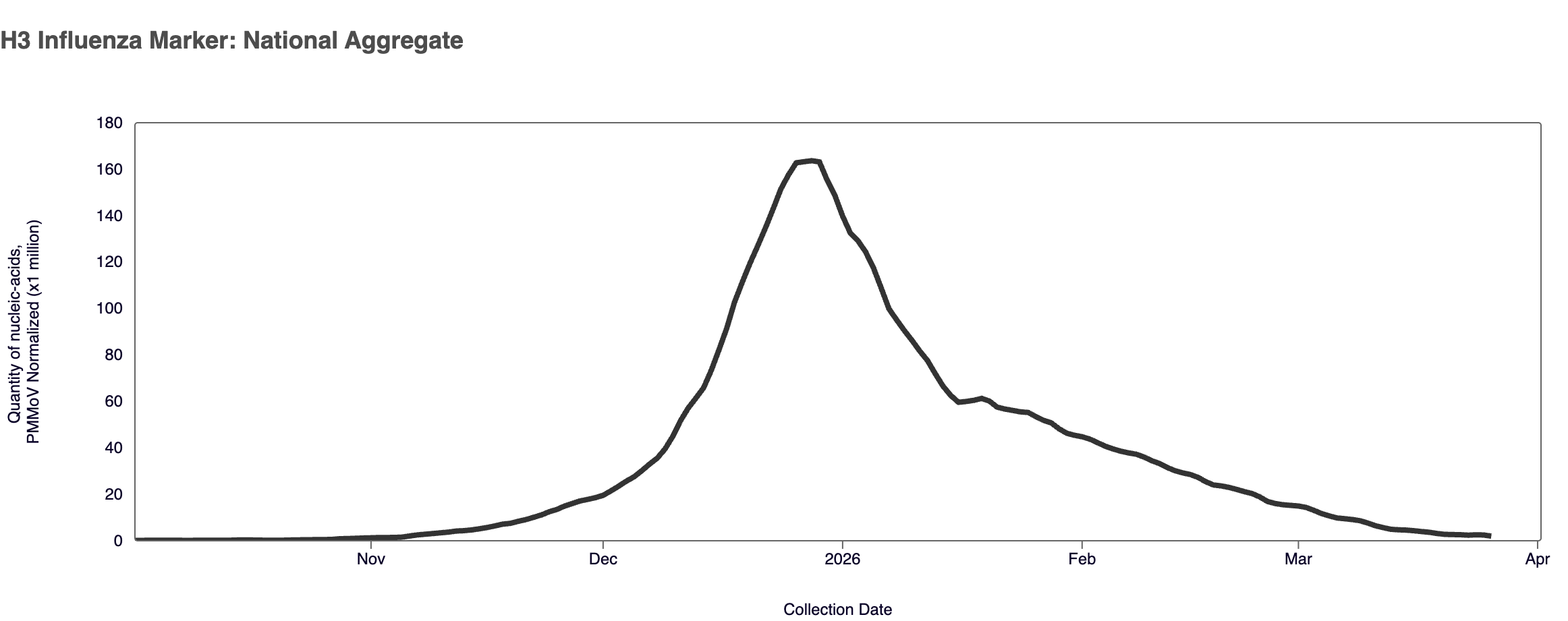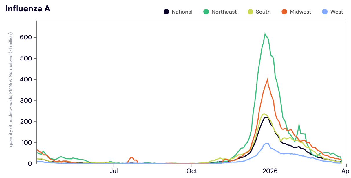 H3 Marker in Influenza A (IAV) In March 2026, the H3 marker in influenza A was detected in ~46% of samples. The H3 median concentration across all sites in March 2026 was below the limit of detection. During this influenza season, the H3 marker appeared to increasingly drive the higher influenza A concentrations. A detection of H3 could include subclade K, a highly-mutated H3N2 variant currently spreading worldwide. You can find a heat map of positive H3 detections here.