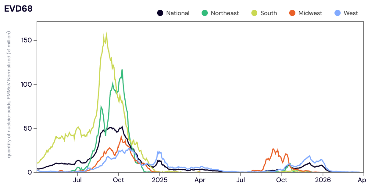 Enterovirus D68 (EV-D68) RNA was detected in ~5% of samples collected in March 2026 (with most positive detections in California). The median concentration across all sites in March 2026 was below the limit of detection. Nationally, EV-D68 is in the 'LOW' Wastewater Category and not in onset.