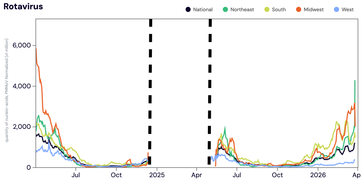 Rota RNA was detected in ~98% of samples from all WWSCAN sites in March 2026. The median concentrations across all sites in March 2026 was 103,779 copies/gram, up ~29% from February 2026.