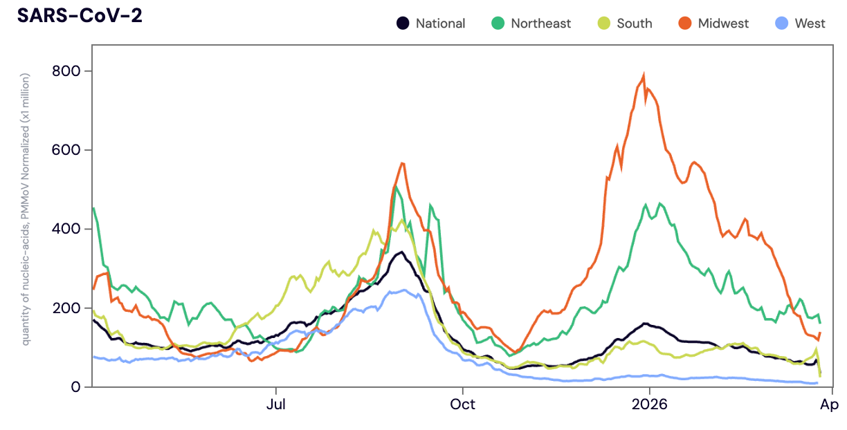 SARS-CoV-2 N gene RNA was detected in ~86% of samples in March 2026. The median SARS-CoV-2 concentration across all sites in March 2026 was 16,876 copies/gram. The median SARS-CoV-2 concentration in March 2026 was down ~46% compared to February 2026. While SARS-CoV-2 concentrations are very low in the West and South, we are continuing to see elevated concentrations across the Northeast region.