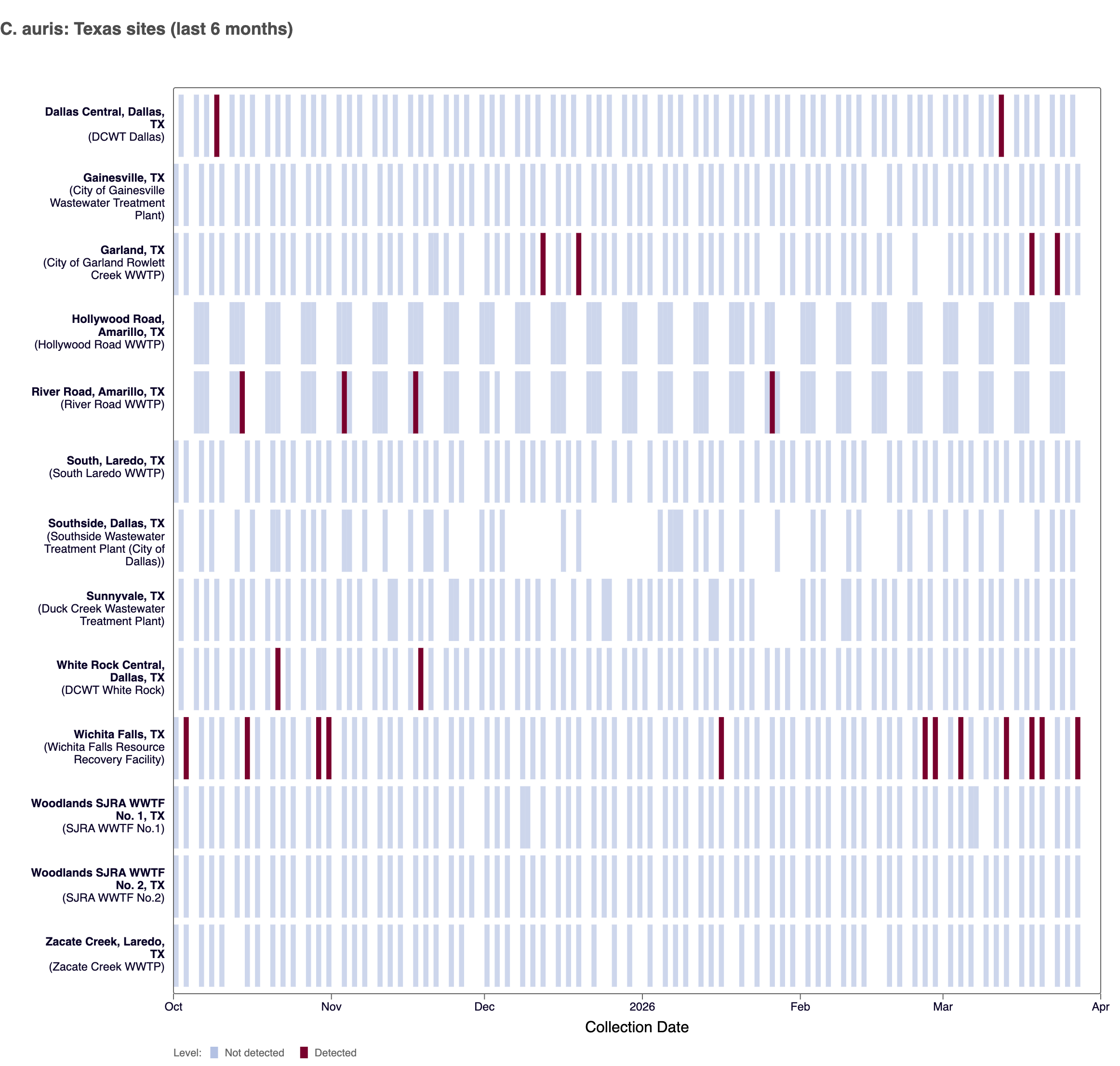 Heat map shows last 6 months of C. auris wastewater data from WWSCAN sites in Texas. Blue indicates non-detect.