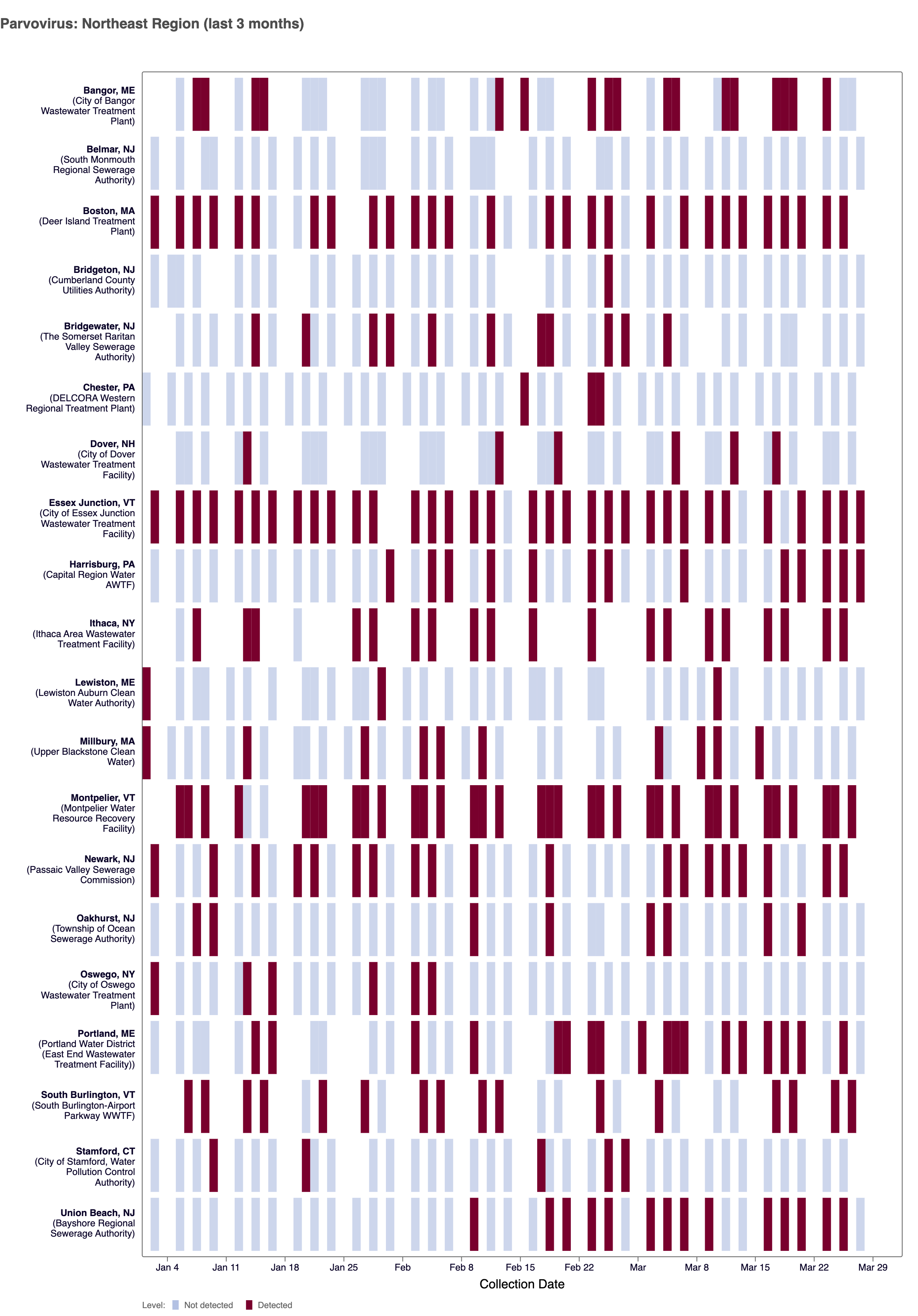 Heat map of positive Parvovirus detections (in red) across sites in the Northeast region participating in WWSCAN over the last 3 months. Blue indicates non-detect.