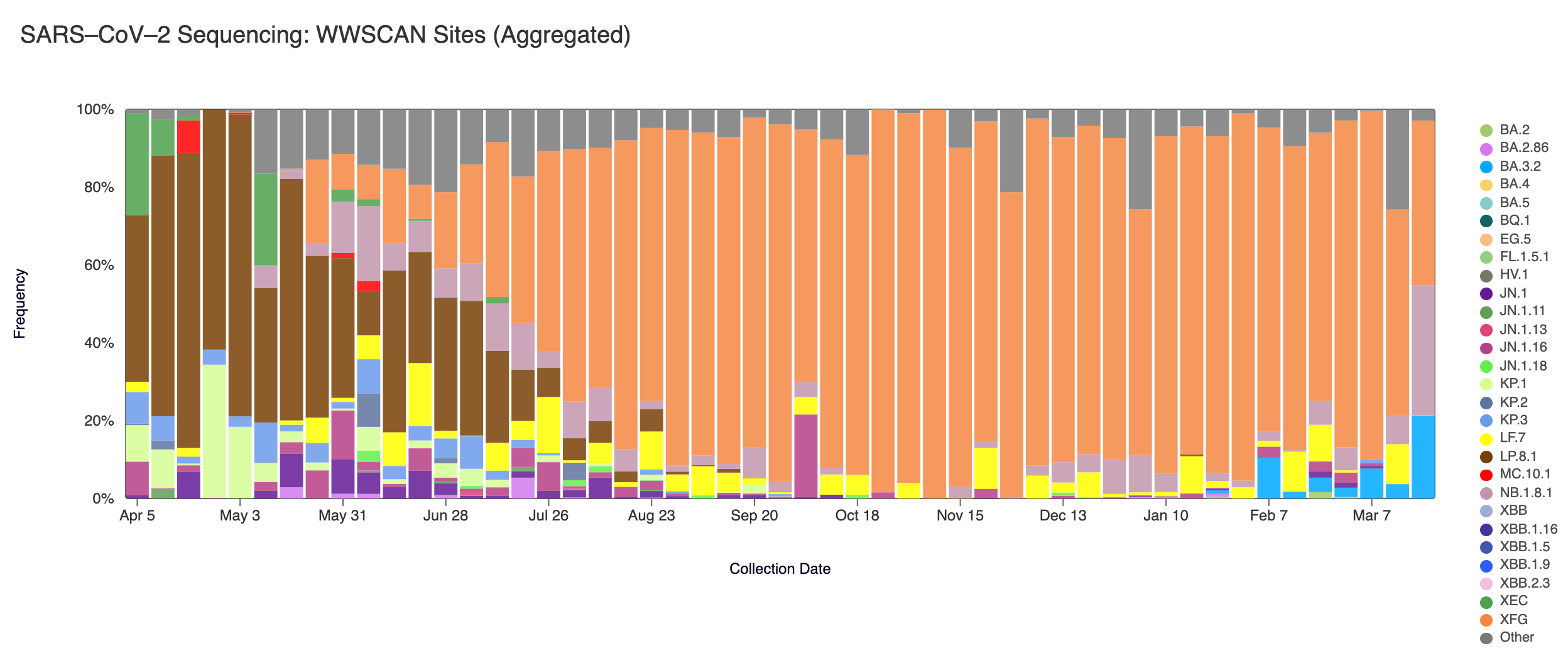 Sequencing data is also available in aggregate across all sites in WWSCAN with sequencing data. That plot is shown below and also suggests that XFG (shown in orange) is the most abundant variant across all sites at 42.3% followed by NB.1.8.1 (shown in mauve) at 33.4%, and BA.3.2 (shown in blue) at 21.2%.