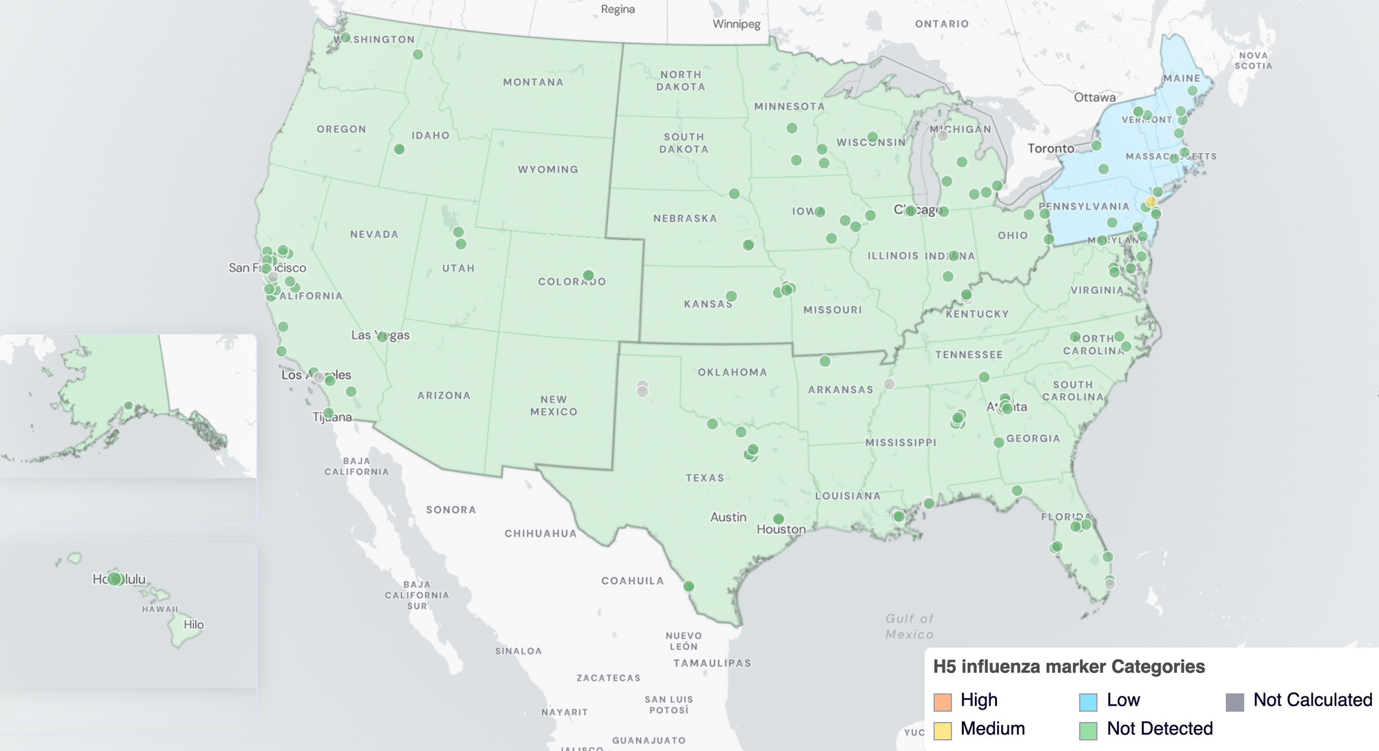 Below are the H5 influenza marker wastewater categories for all WWSCAN sites (recall the category is determined by the frequency of detection).