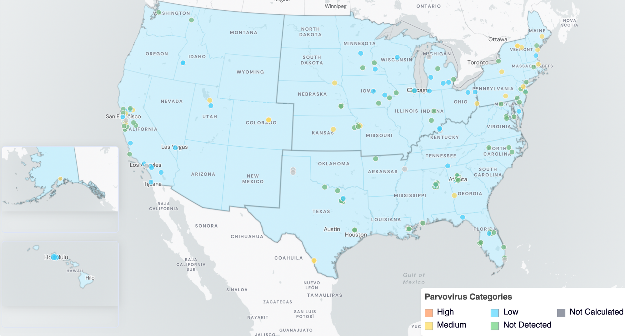 Below are the Parvovirus wastewater categories for all WWSCAN sites (recall the category is determined by the frequency of detection).