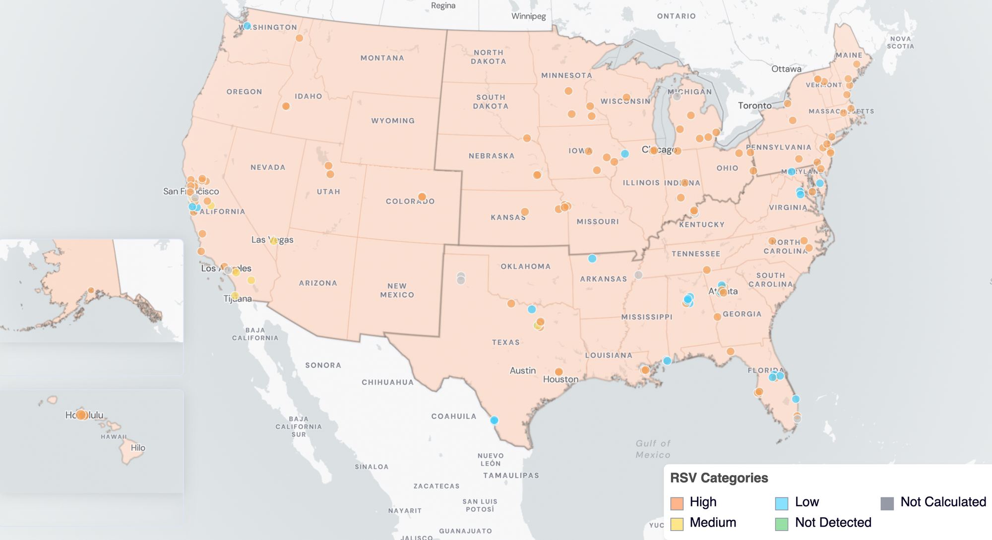 Below are the current RSV wastewater categories for all WWSCAN sites (recall the category is determined by both the trend and the level when in seasonal onset).