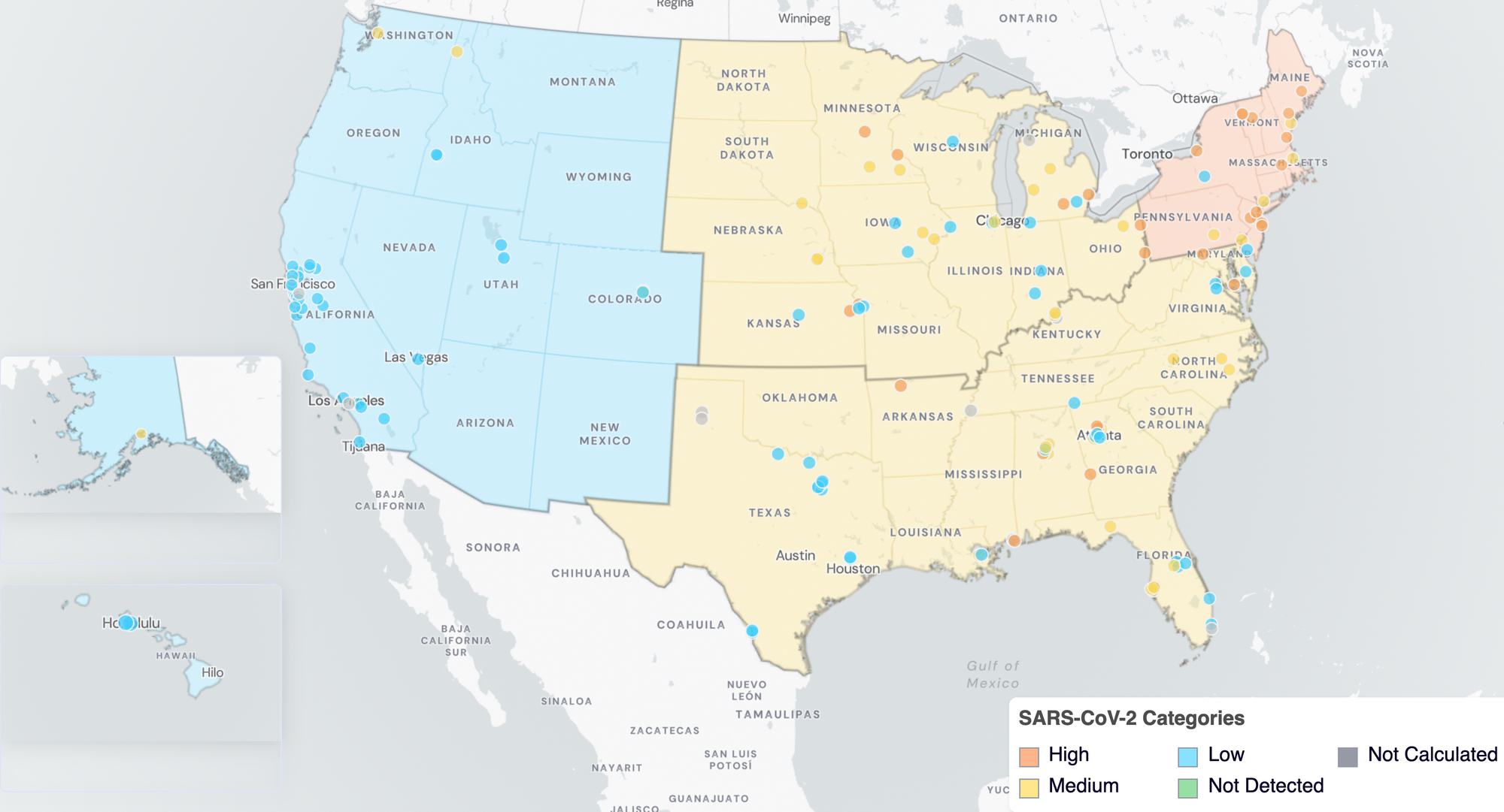 SARS-CoV-2 Wastewater Categories. This map includes sample collection data through March 30, 2026. Each dot represents a single site and the four US Census regions are outlined in gray. Midwest Region includes: IA, IL, IN, KS, MI, MN, NE, OH, SD, WI. Northeast Region includes: CT, MA, ME, NH, NJ, NY, PA, VT. Southern Region includes: AL, AR, DE, FL, GA, KY, LA, MD, MS, NC, TN, TX, VA, and WV. Western Region includes: AK, CA, CO, HI, ID, NV, UT, WA.