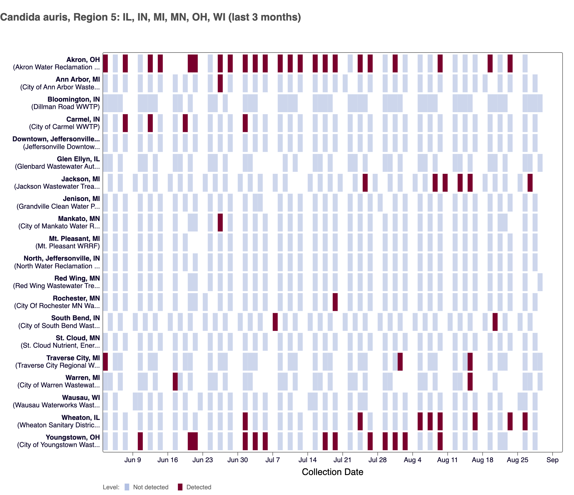 The chart below shows plants in HHS region 5 as rows, and days as columns (labeled at the bottom axis). White indicates no samples, blue is non-detect for C. auris DNA and red is detect for C. auris DNA.