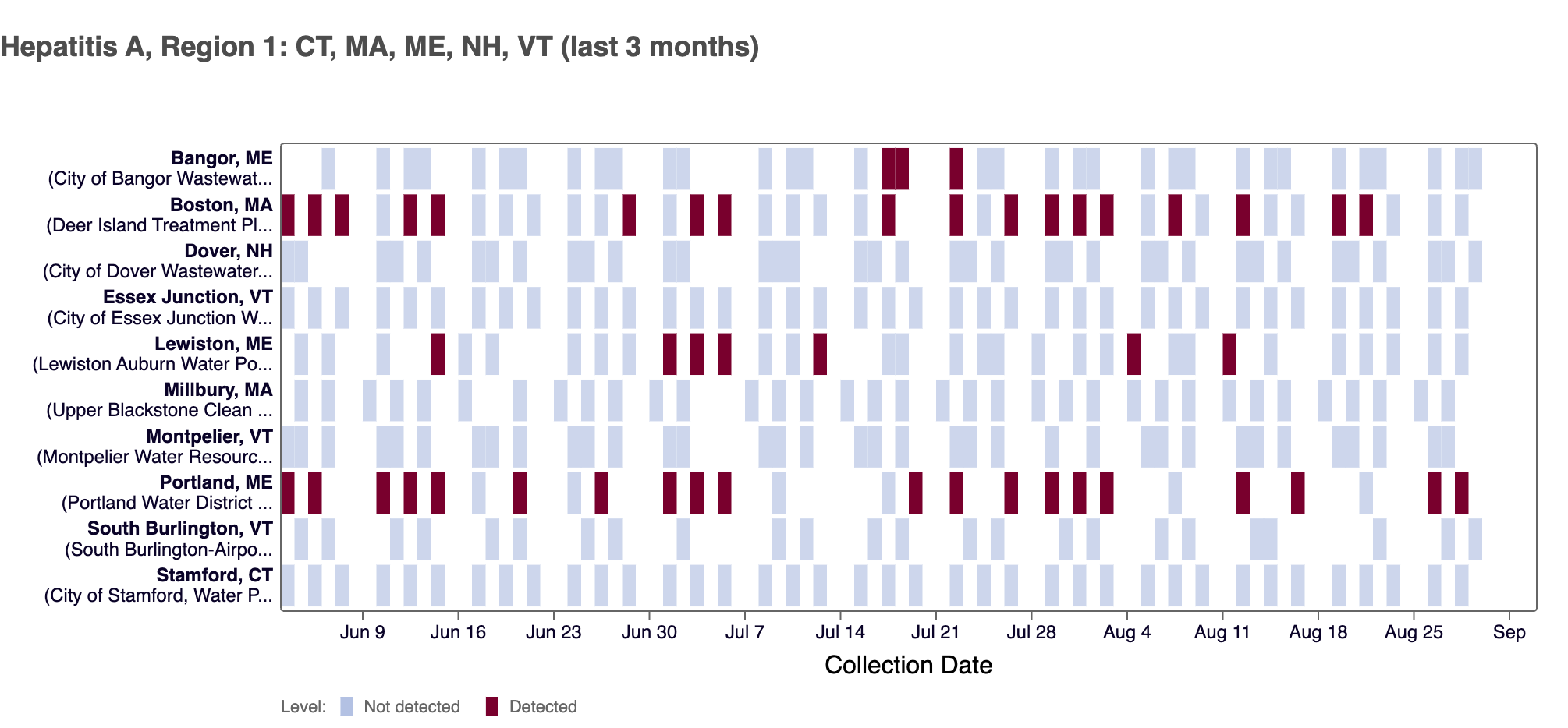 The chart below shows each WWSCAN plant in HHS Region 1 as rows, and days as columns (labeled at the bottom axis). White indicates no samples, blue is a non-detect for Hep A RNA and red is a detection for Hep A RNA.