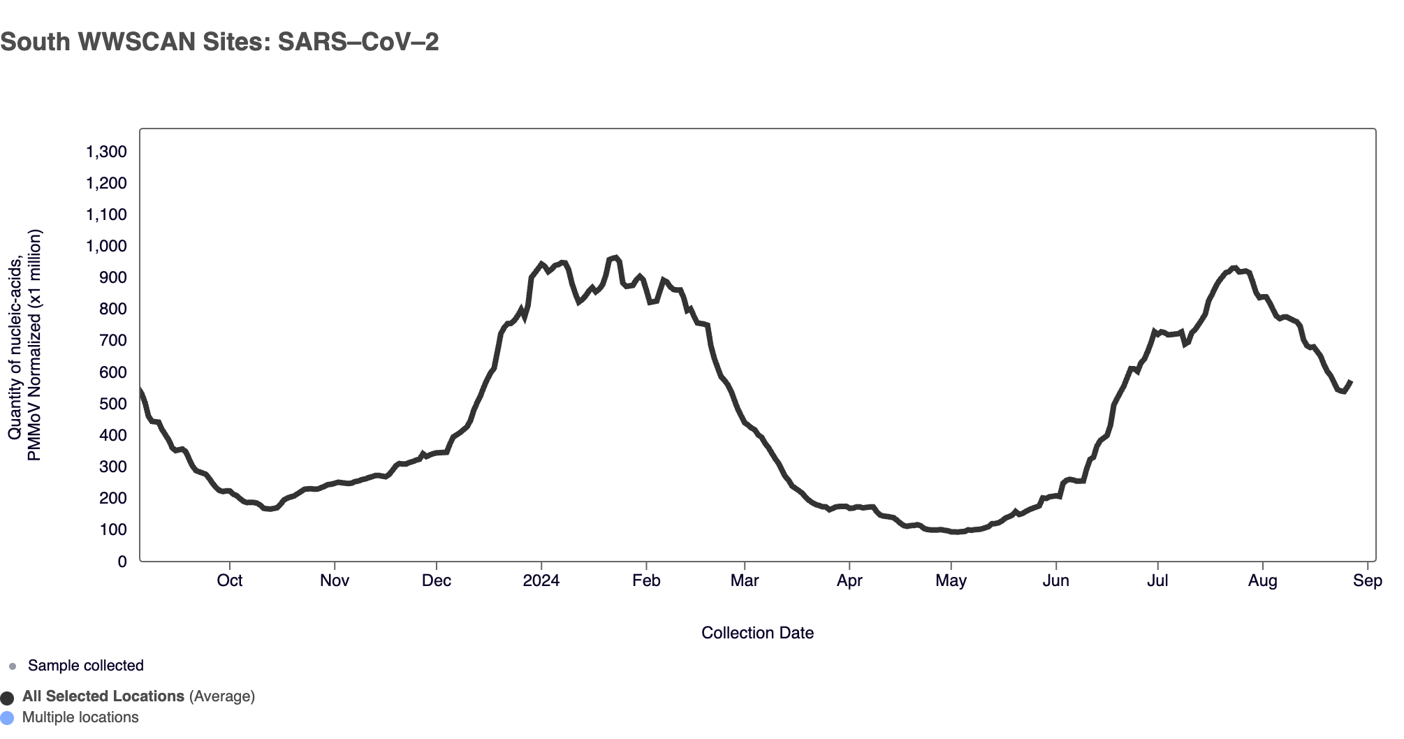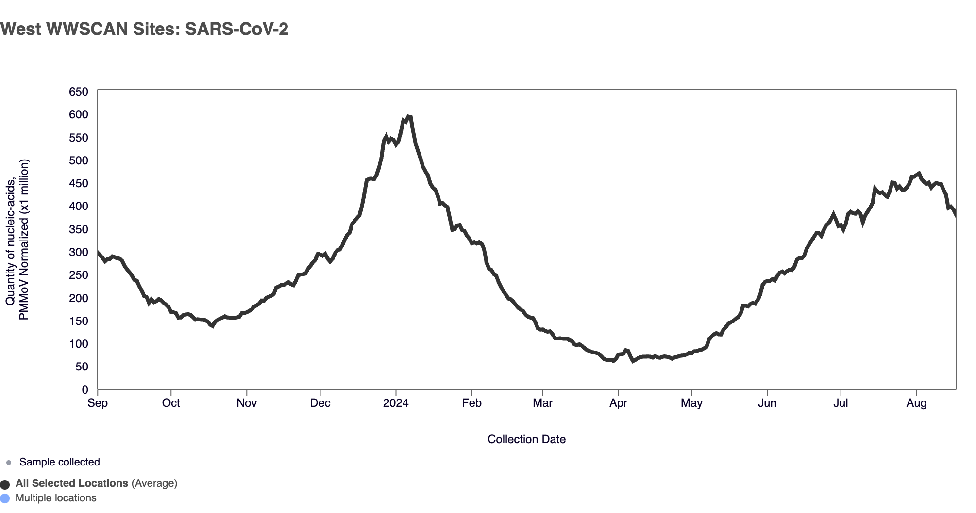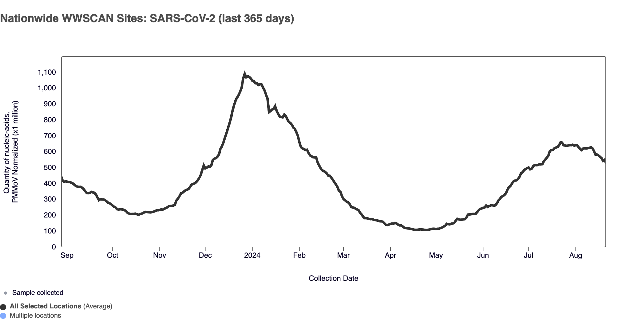 SARS-CoV-2 N gene RNA median concentration across all sites in August 2024 was 182,288 copies/gram. For reference, the median concentration in July 2024 was 188,660 copies/gram. Below is the population weighted average SARS-CoV-2 N gene concentrations (normalized by PMMoV) from all participating WWSCAN sites across the country over the last 365 days.