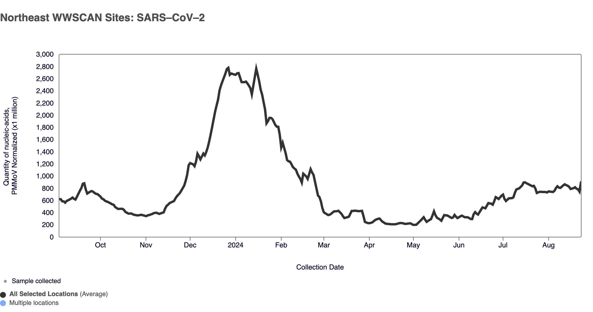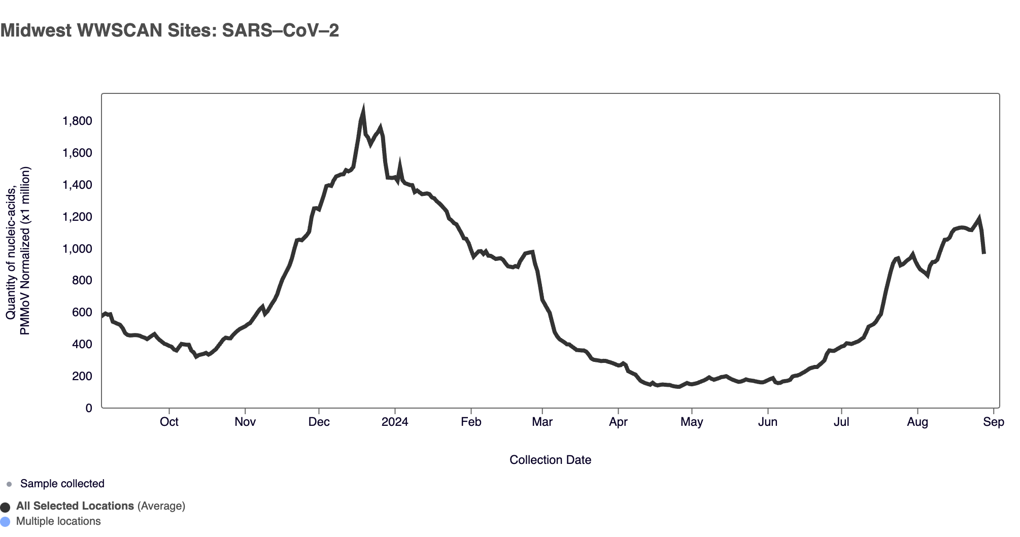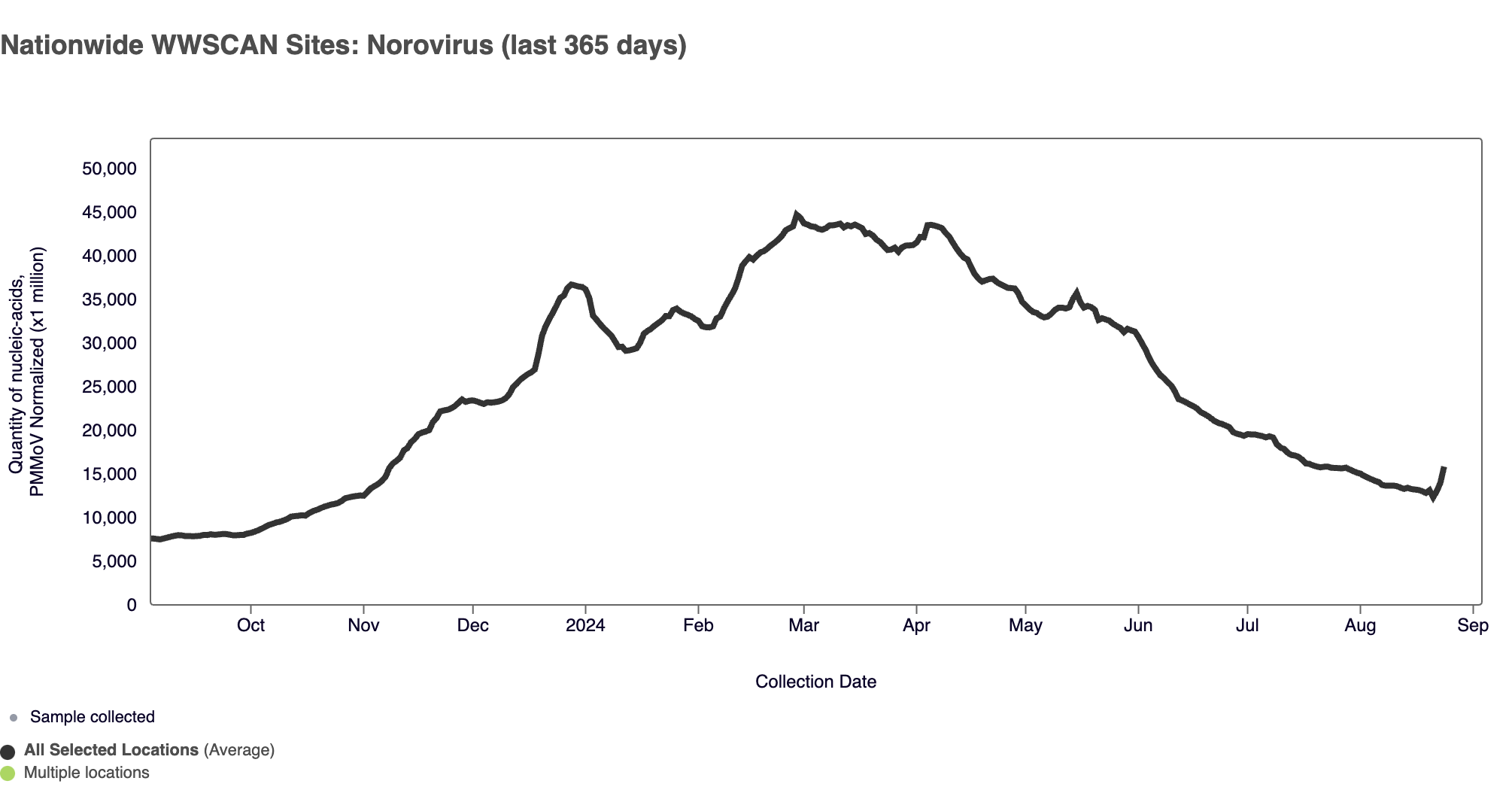 SARS-CoV-2 N gene RNA median concentration across all sites in August 2024 was 182,288 copies/gram. For reference, the median concentration in July 2024 was 188,660 copies/gram. Below is the population weighted average SARS-CoV-2 N gene concentrations (normalized by PMMoV) from all participating WWSCAN sites across the country over the last 365 days.