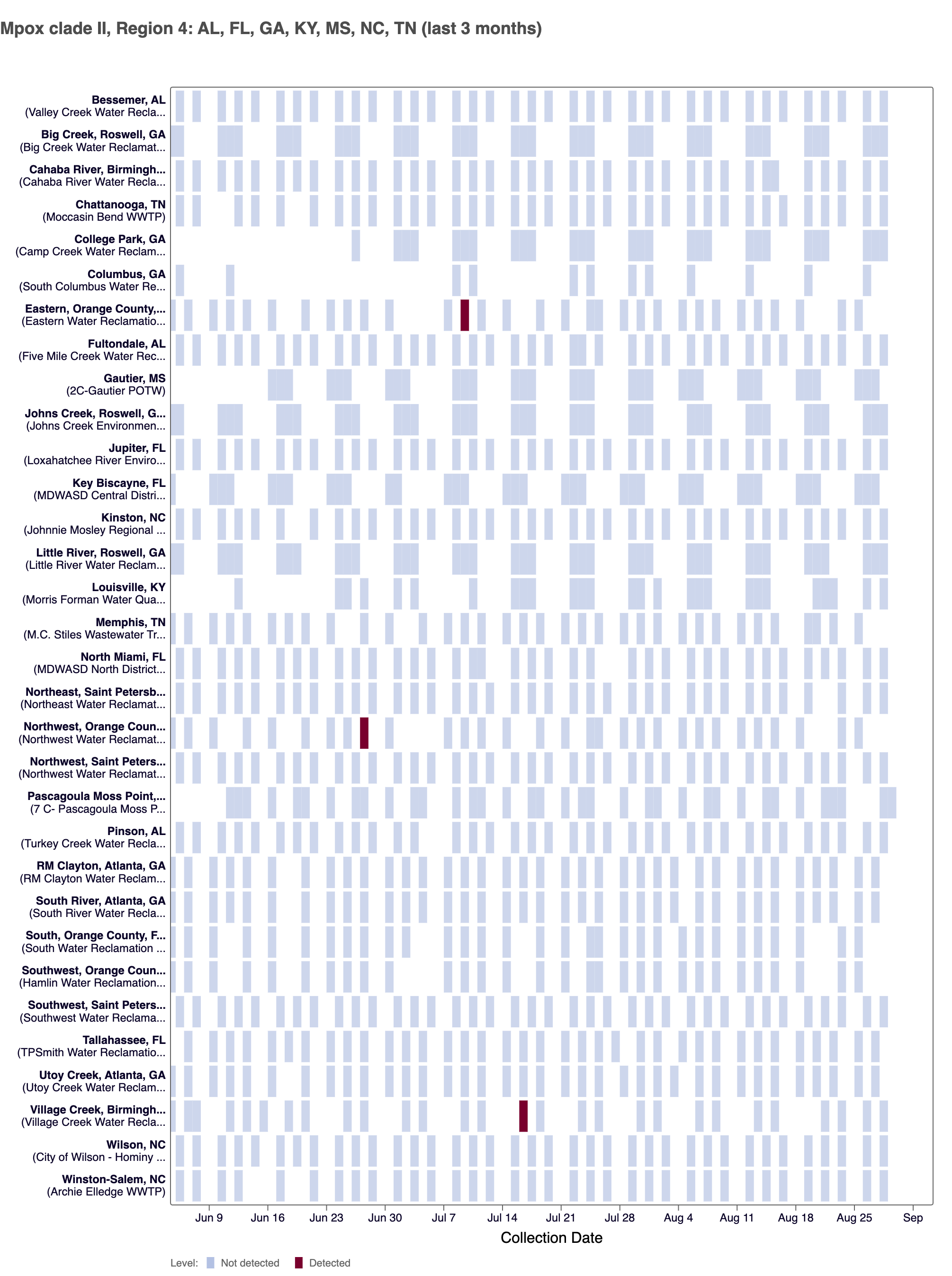 The chart below plants in HHS region 4 as rows, and days as columns (labeled at the bottom axis). White indicates no samples, blue is non-detect for mpox DNA and red is detect for mpox DNA.