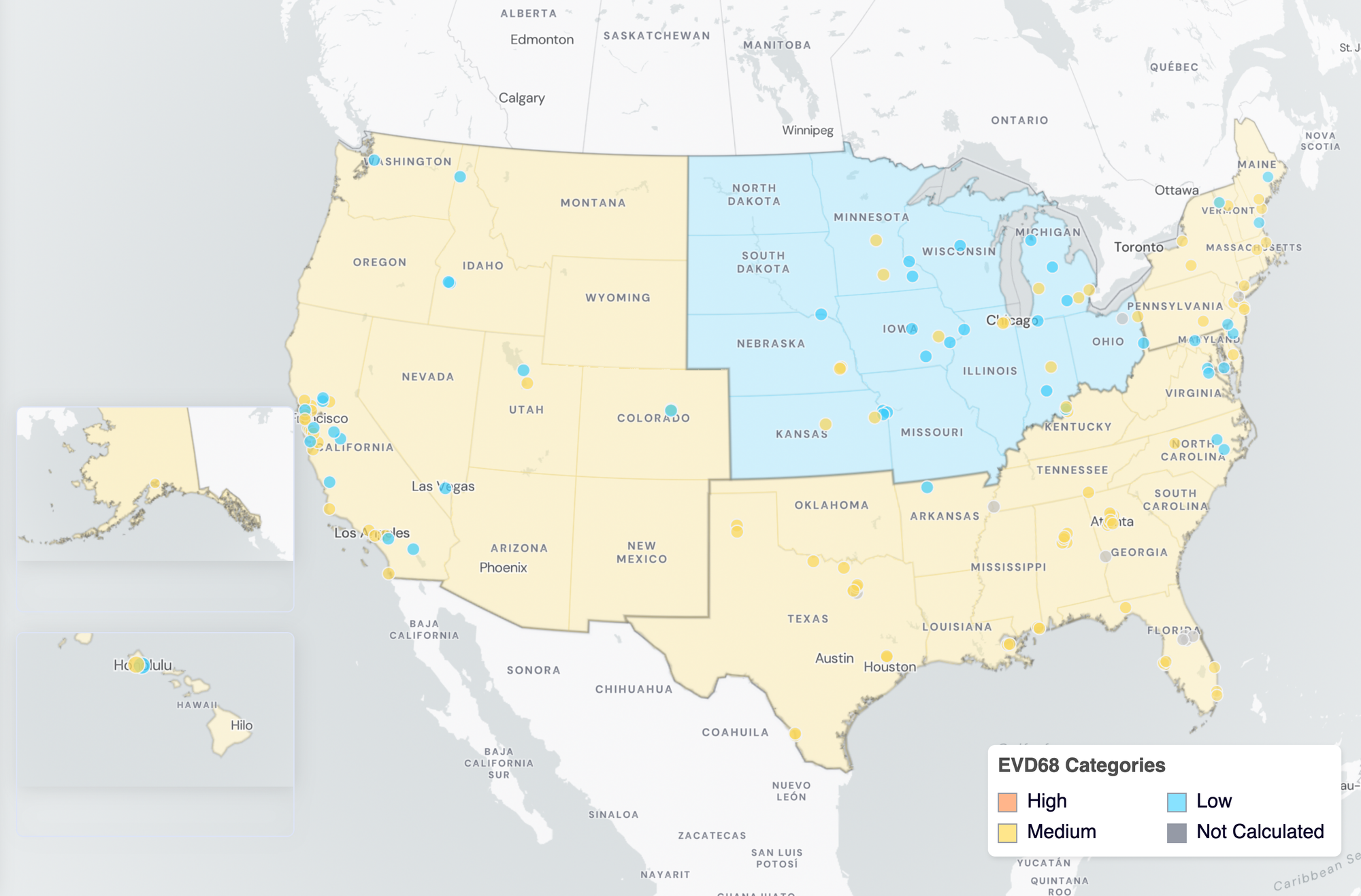 Below are the current EV-D68 wastewater categories for all WWSCAN sites (recall the category is determined by the frequency of detection):