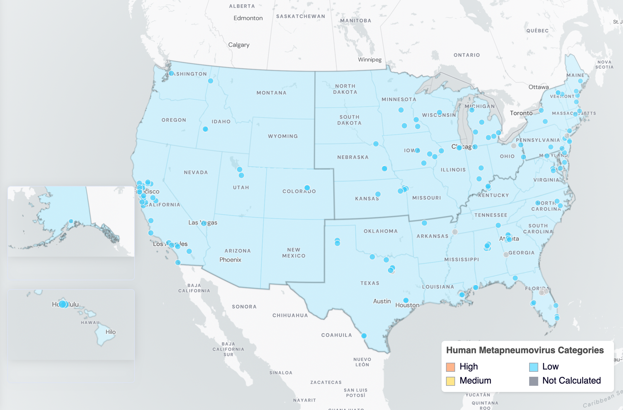 Nationally, HMPV is in the "LOW" Wastewater Category with <50% of sites showing onset of HMPV in wastewater.