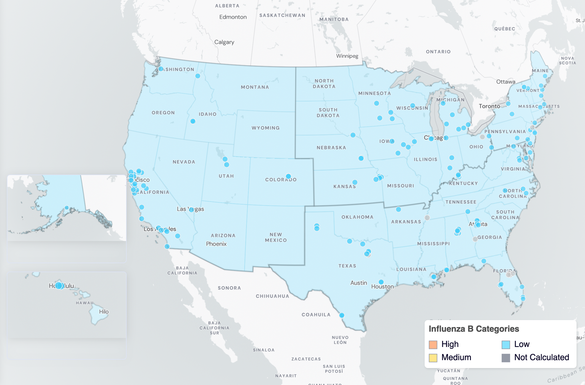 Below are the current Influenza B wastewater categories for all WWSCAN sites (recall the category is determined by both the trend and the level when in seasonal onset):