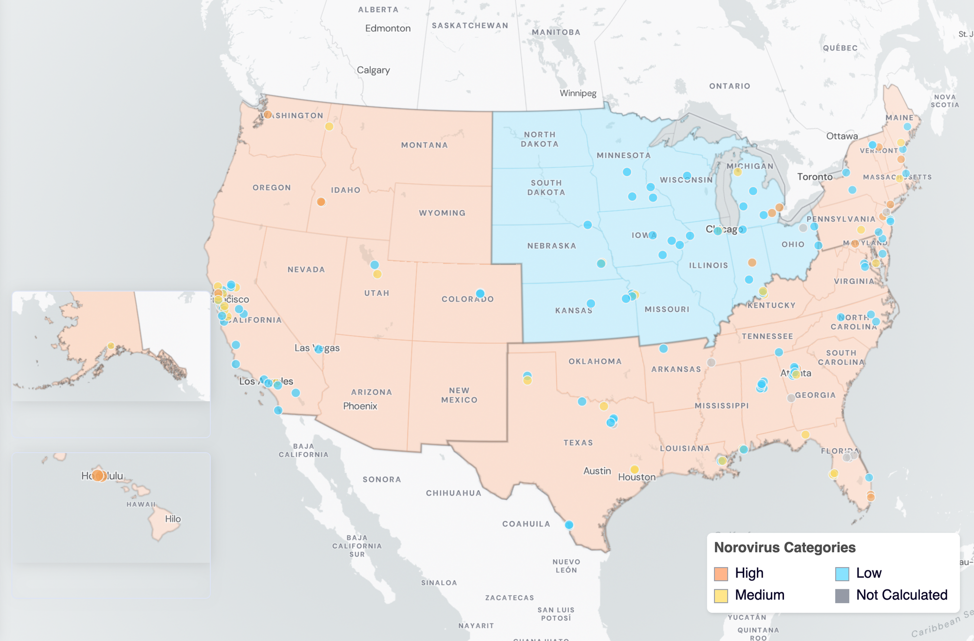 Norovirus Wastewater Categories. This map includes sample collection data through August 31, 2024. Each dot represents a single site and the four US Census regions are outlined in gray. Midwest states: IA, IL, IN, KS, MI, MN, NE, OH, SD, WI. Northeast states: CT, MA, ME, NH, NJ, NY, PA, VT. Southern states: AL, AR, DE, FL, GA, KY, LA, MD, MS, NC, TN, TX, VA, WV and Washington DC. Western States: AK, CA, CO, HI, ID, NV, UT, WA.