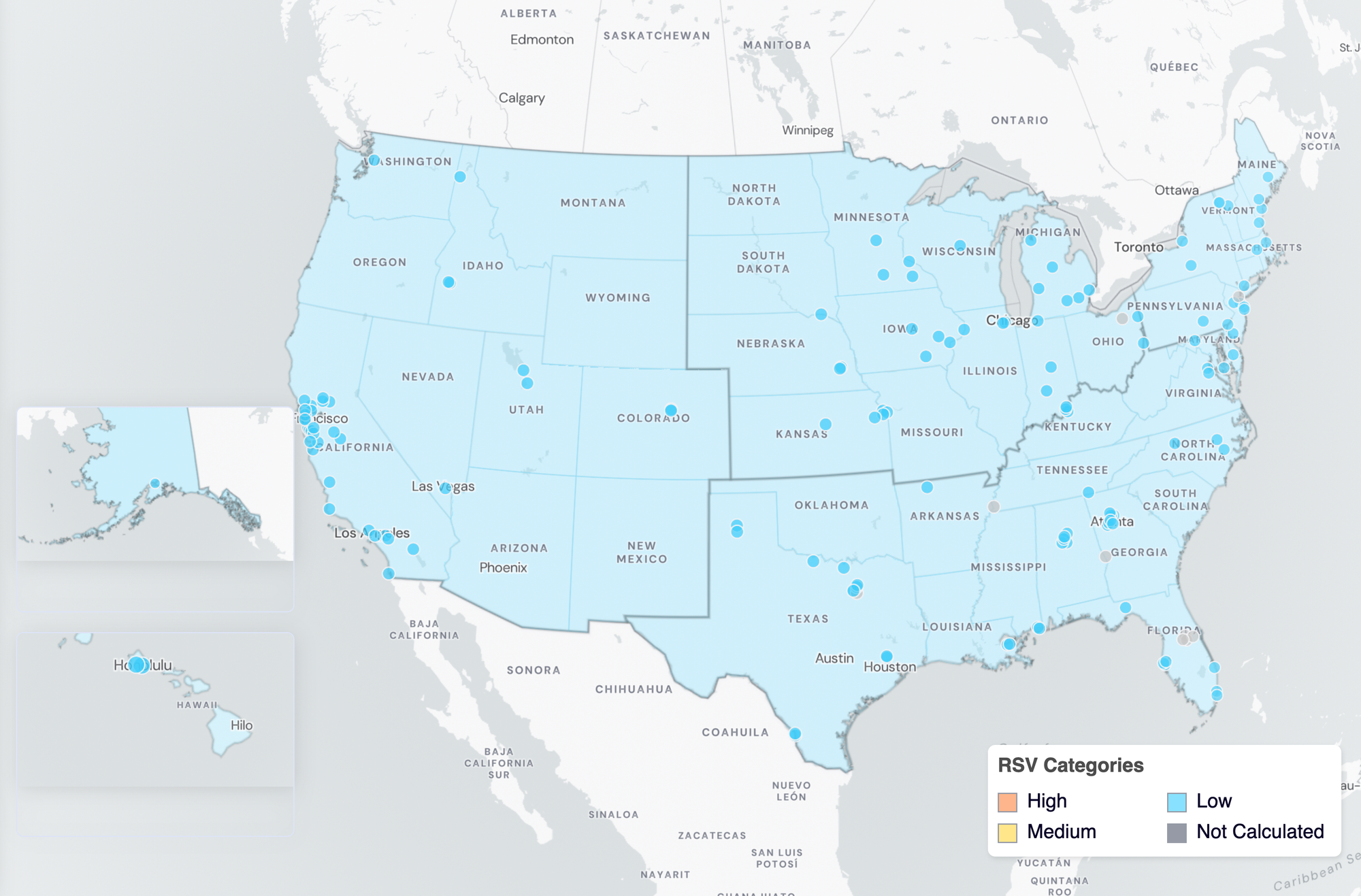 RSV Wastewater Categories. This map includes sample collection data through August 31, 2024. Each dot represents a single site and the four US Census regions are outlined in gray. Midwest Region includes: IA, IL, IN, KS, MI, MN, NE, OH, SD, WI. Northeast Region includes: CT, MA, ME, NH, NJ, NY, PA, VT. Southern Region includes: AL, AR, DE, FL, GA, KY, LA, MD, MS, NC, TN, TX, VA, WV and Washington DC. Western Region includes: AK, CA, CO, HI, ID, NV, UT, WA.