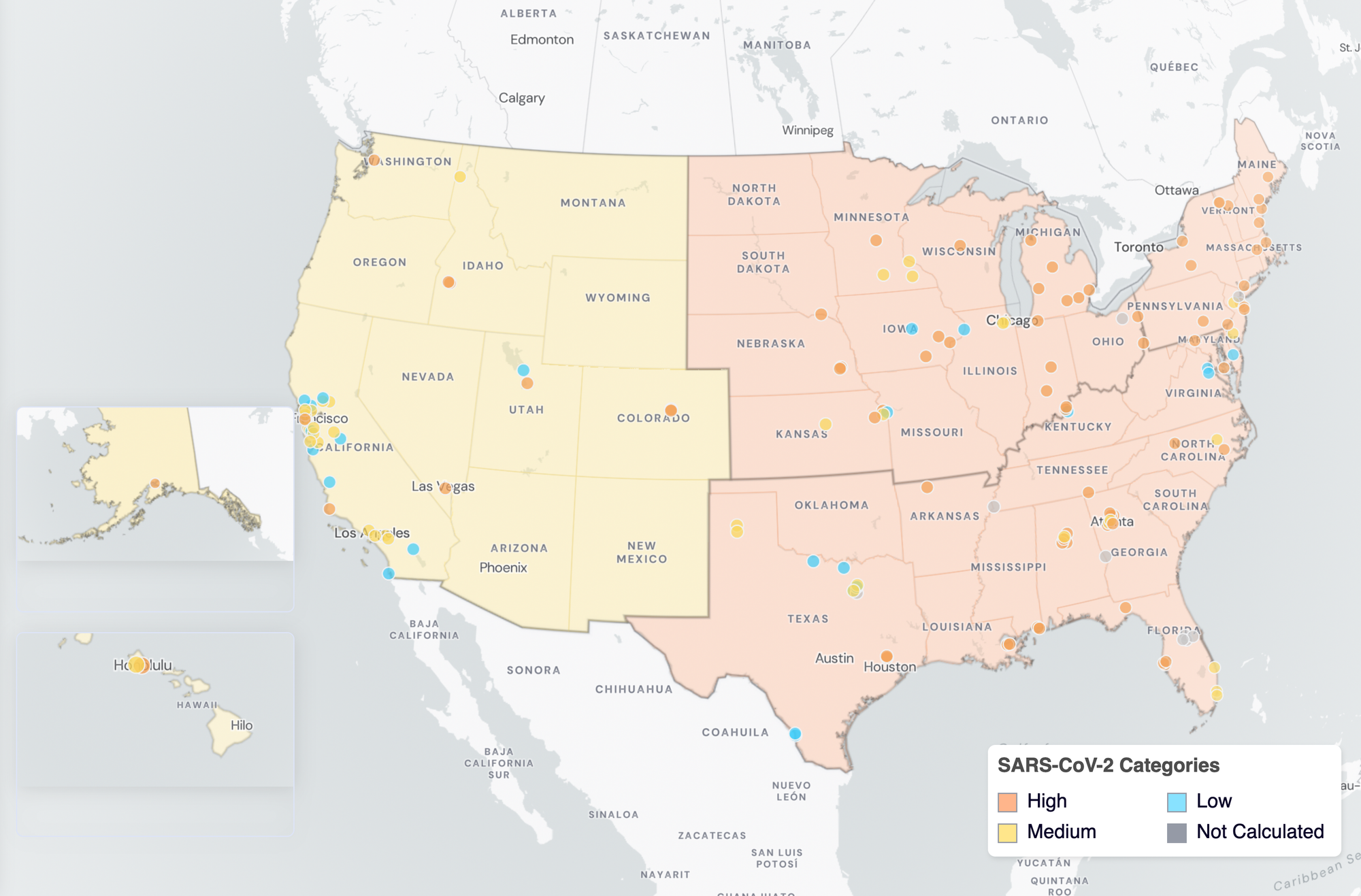 Below are the current SARS-CoV-2 wastewater categories for all WWSCAN sites (recall the category is determined by both the trend and the level):