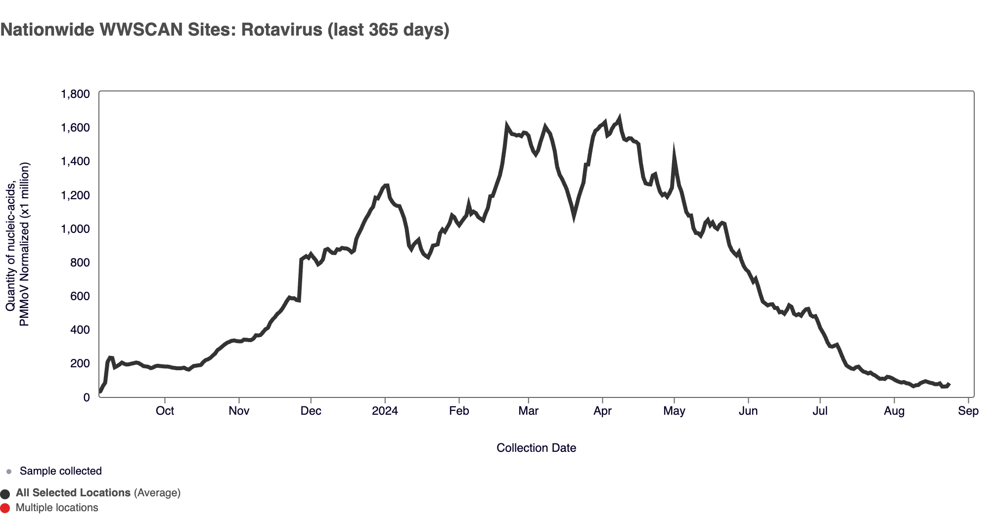 Rotavirus RNA median concentrations across all sites in August 2024 is 8,205 copies/gram. For reference, the median concentration in July 2024 was 21,367 copies/gram. Below are the Rotavirus RNA concentrations (normalized by PMMoV) from all participating WWSCAN sites across the country. The population-weighted average is shown.