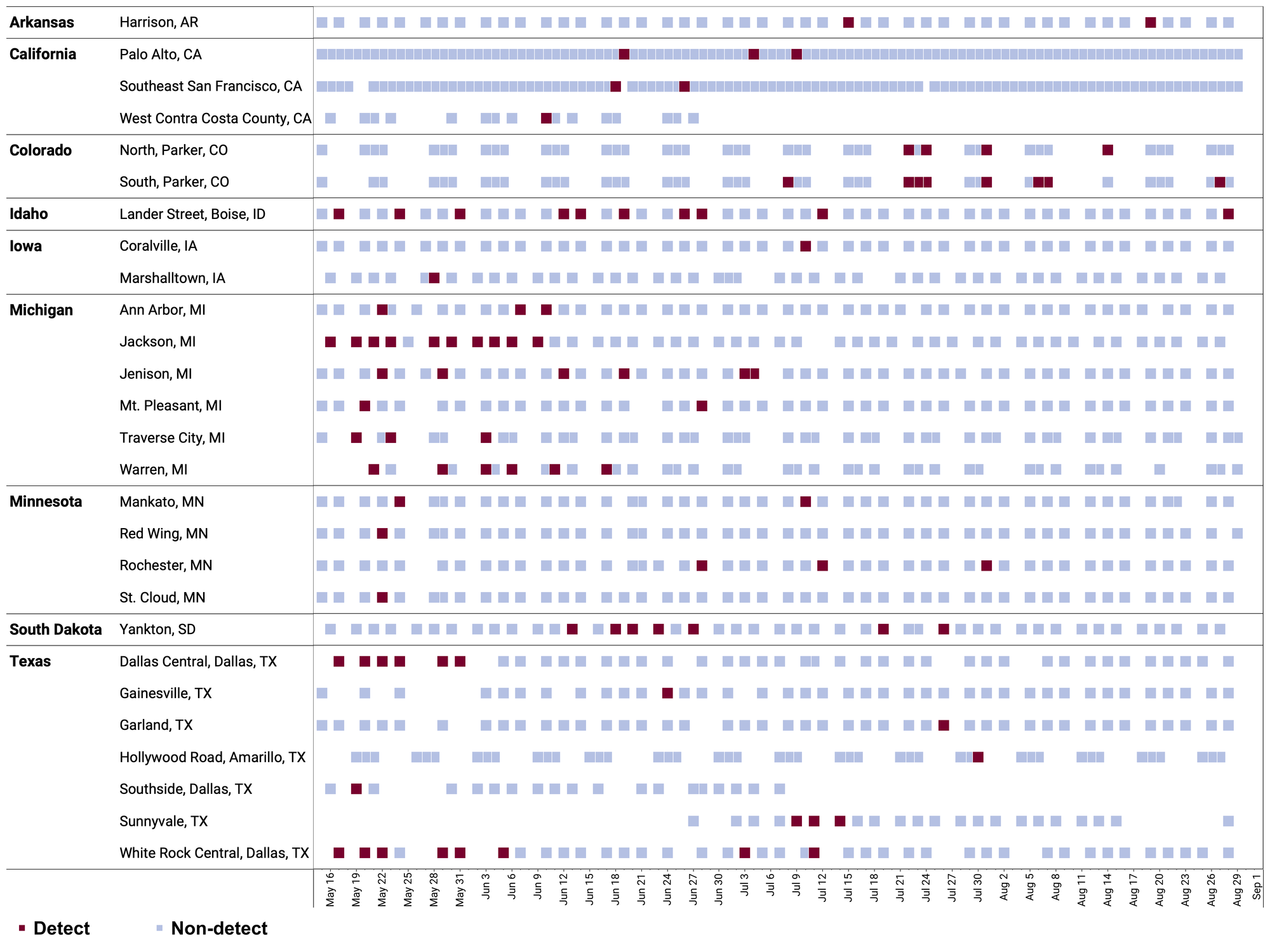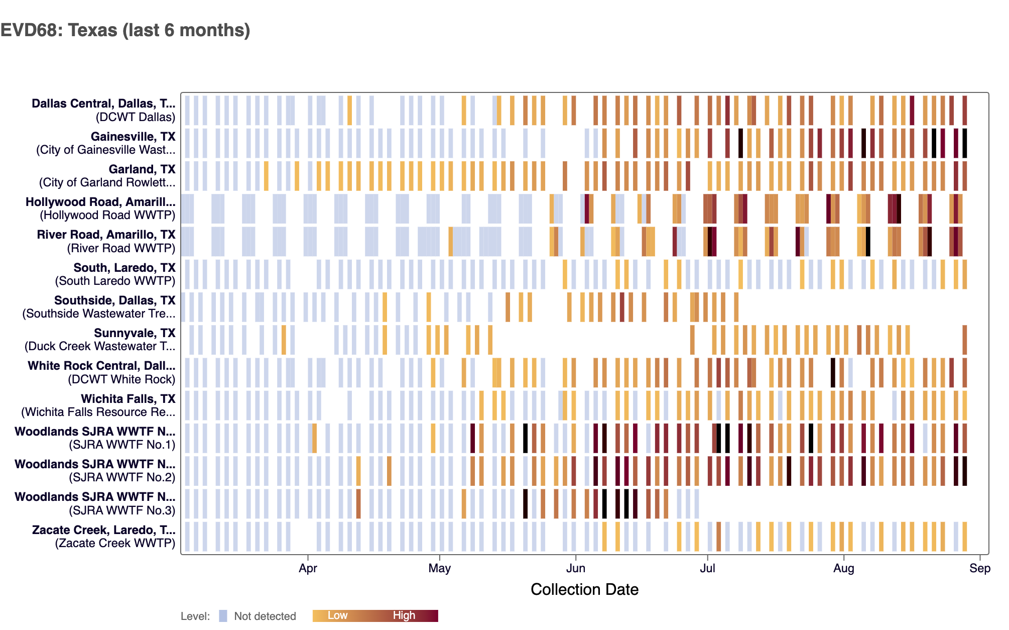The chart below plants in Texas as rows, and the days as columns (labeled at the bottom axis). White indicates no samples, blue is non-detect for EV-D68 RNA and red is detect for EV-D68 RNA.