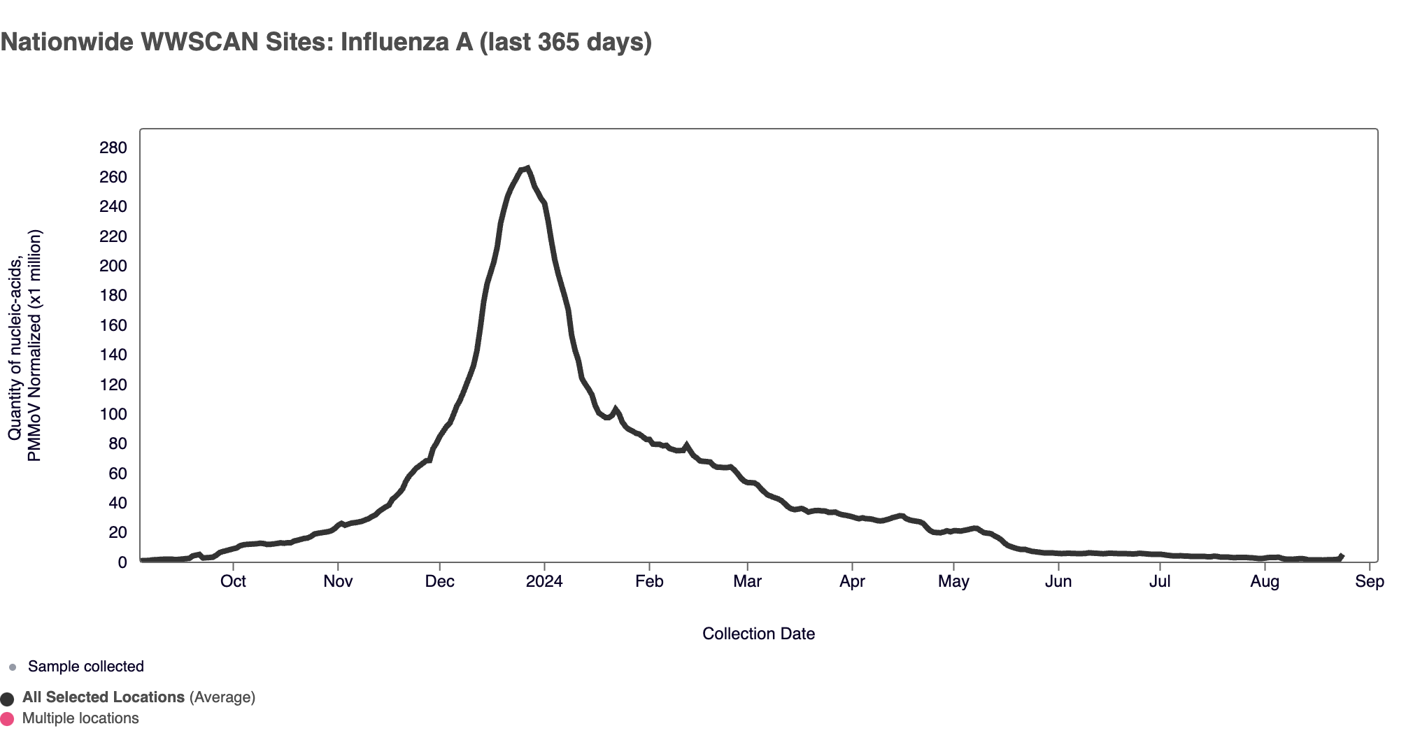 Influenza A (IAV) RNA median concentration across all sites August 2024 was below the limit of detection. For reference, the median concentration in July 2024 was below the limit of detection as well. Below is the population weighted average IAV concentrations (normalized by PMMoV) from all participating WWSCAN sites across the country over the last 365 days.