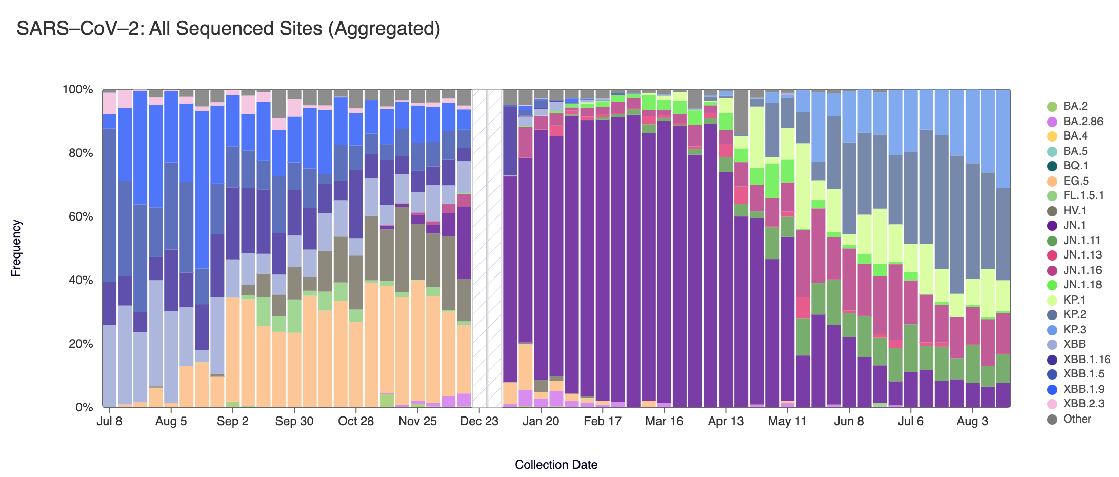 Sequencing data is also available in aggregate across all sites in WWSCAN with sequencing data. That plot is shown below and also suggests that KP.3 (shown in light blue) is the most abundant variant across all sites (30.9%) followed by KP.2 (shown in slate blue) (29%) and JN.1.1.16 (shown in pink) (12.6%).
