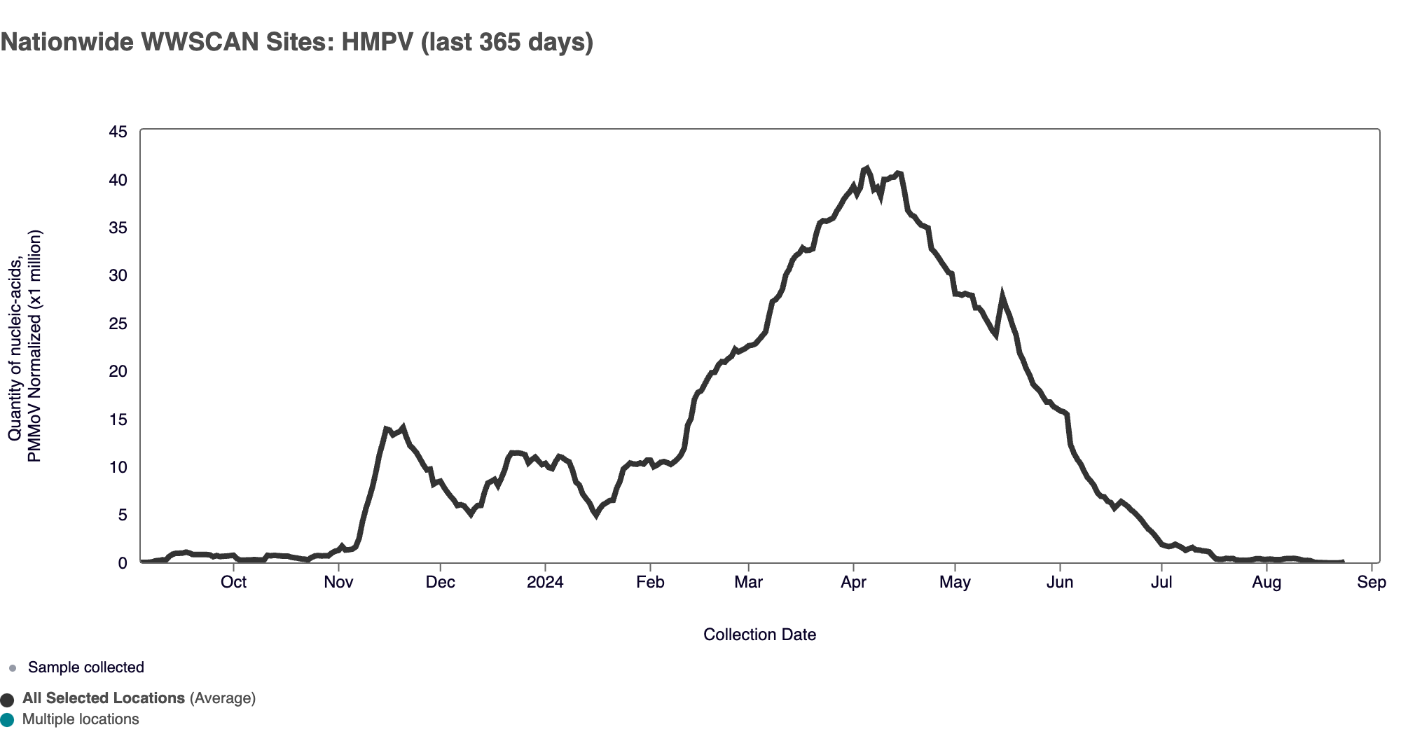 HMPV (human metapneumovirus) RNA median concentrations across all sites in August 2024 was below the level of detection. HMPV RNA was detected in ~6% of samples in August 2024. Below is the population weighted average HMPV RNA concentrations (normalized by PMMoV) from all participating WWSCAN sites across the country over the last 365 days.