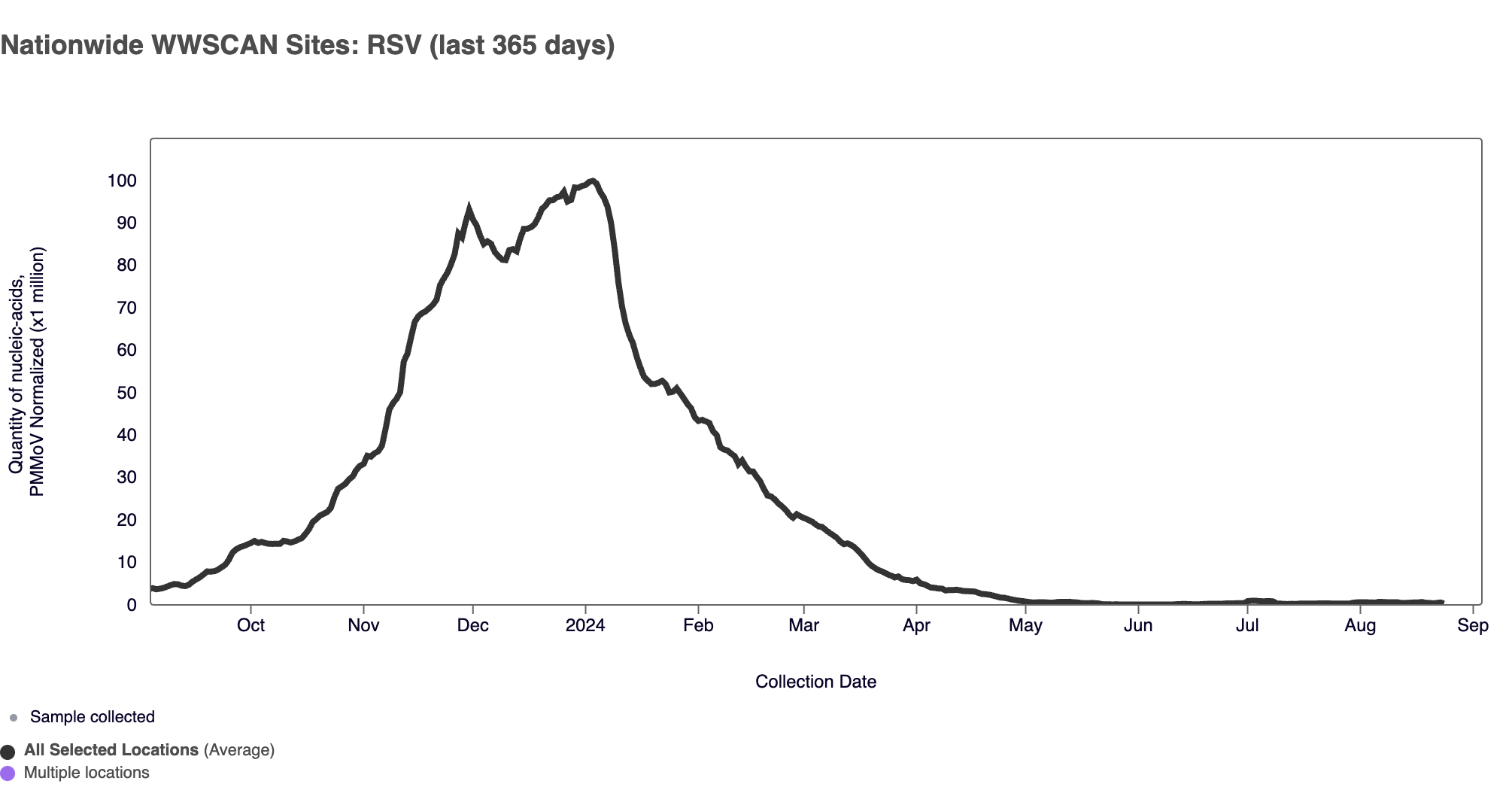 Respiratory syncytial virus (RSV) RSV RNA median concentration across all sites in August 2024 was below the limit of detection. Below are the RSV RNA concentrations (normalized by PMMoV) from all participating WWSCAN sites across the country over the last 365 days shown as the population-weighted average.