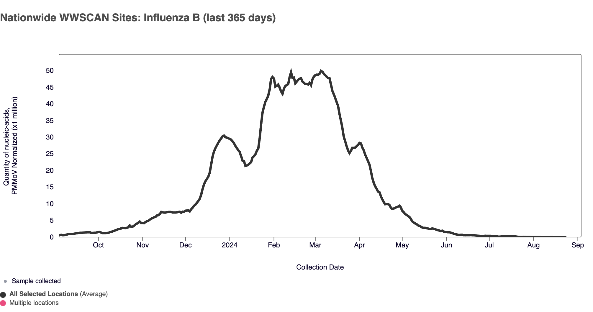 Influenza B (IBV) RNA was detected in ~1.7% of samples in August 2024. IBV RNA median concentration across all sites in August 2024 was below the limit of detection. Below is the population-weighted average IBV RNA concentrations (normalized by PMMoV) from all participating WWSCAN sites across the country over the last 365 days.