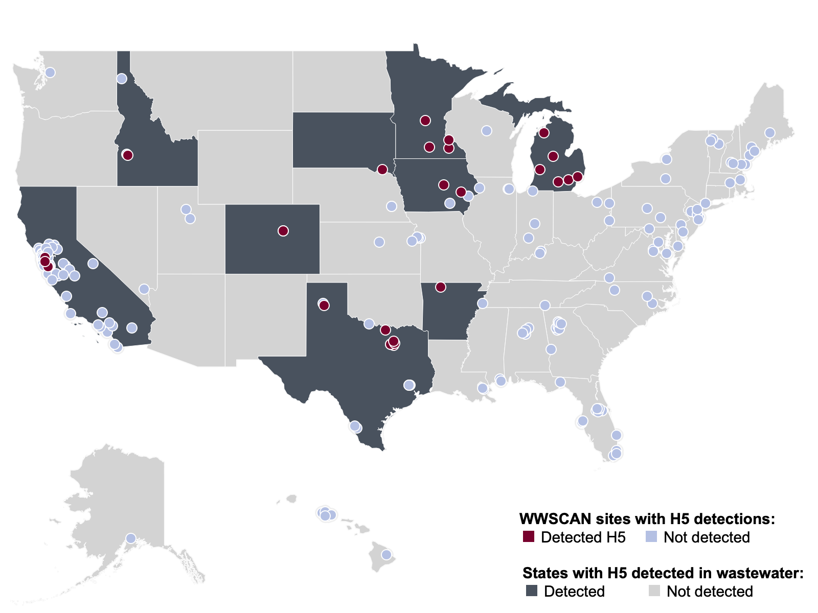 H5 Marker in Influenza A (IAV) Since we started monitoring for the H5 marker in influenza A, 27 WastewaterSCAN sites have seen positive detections.