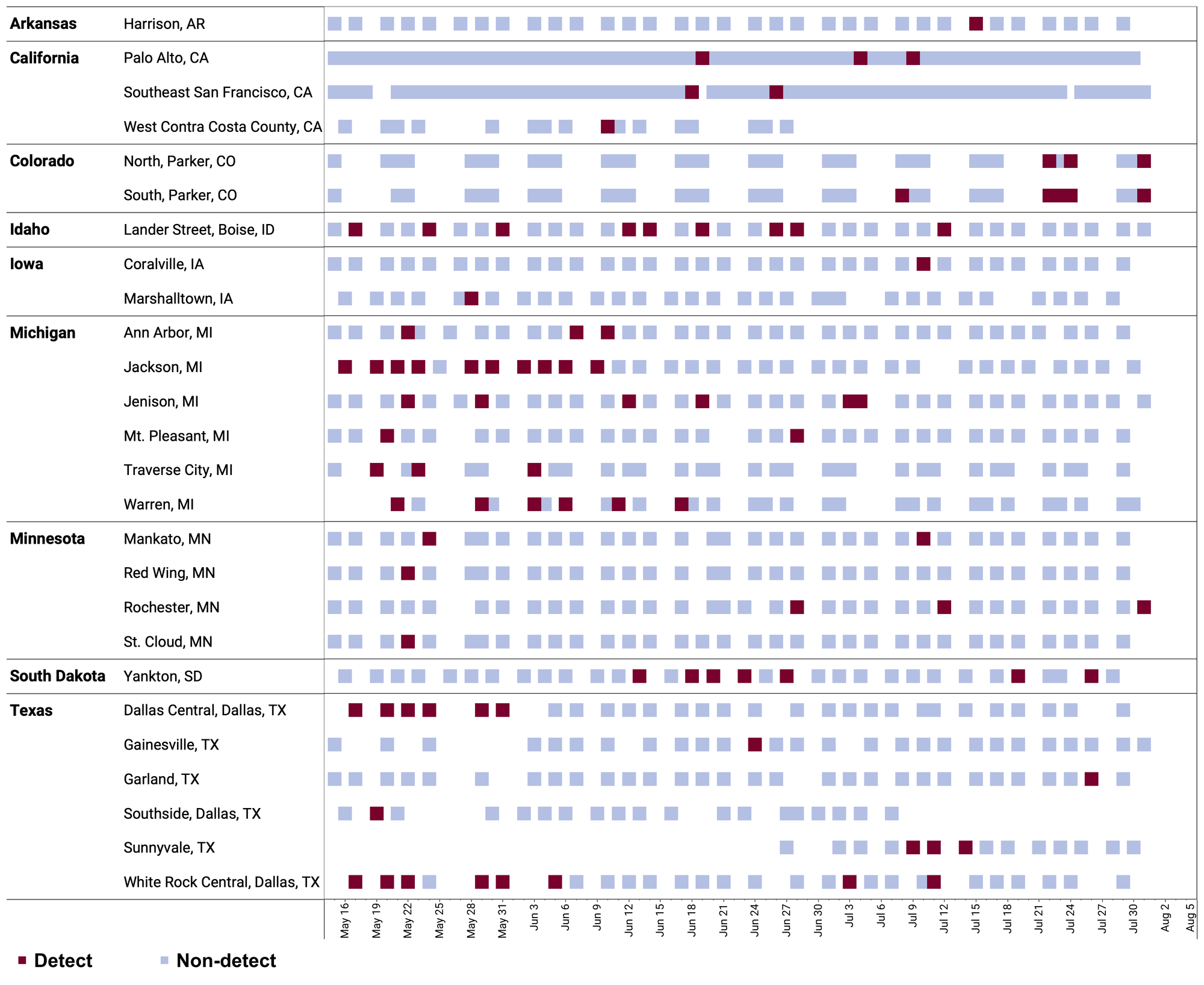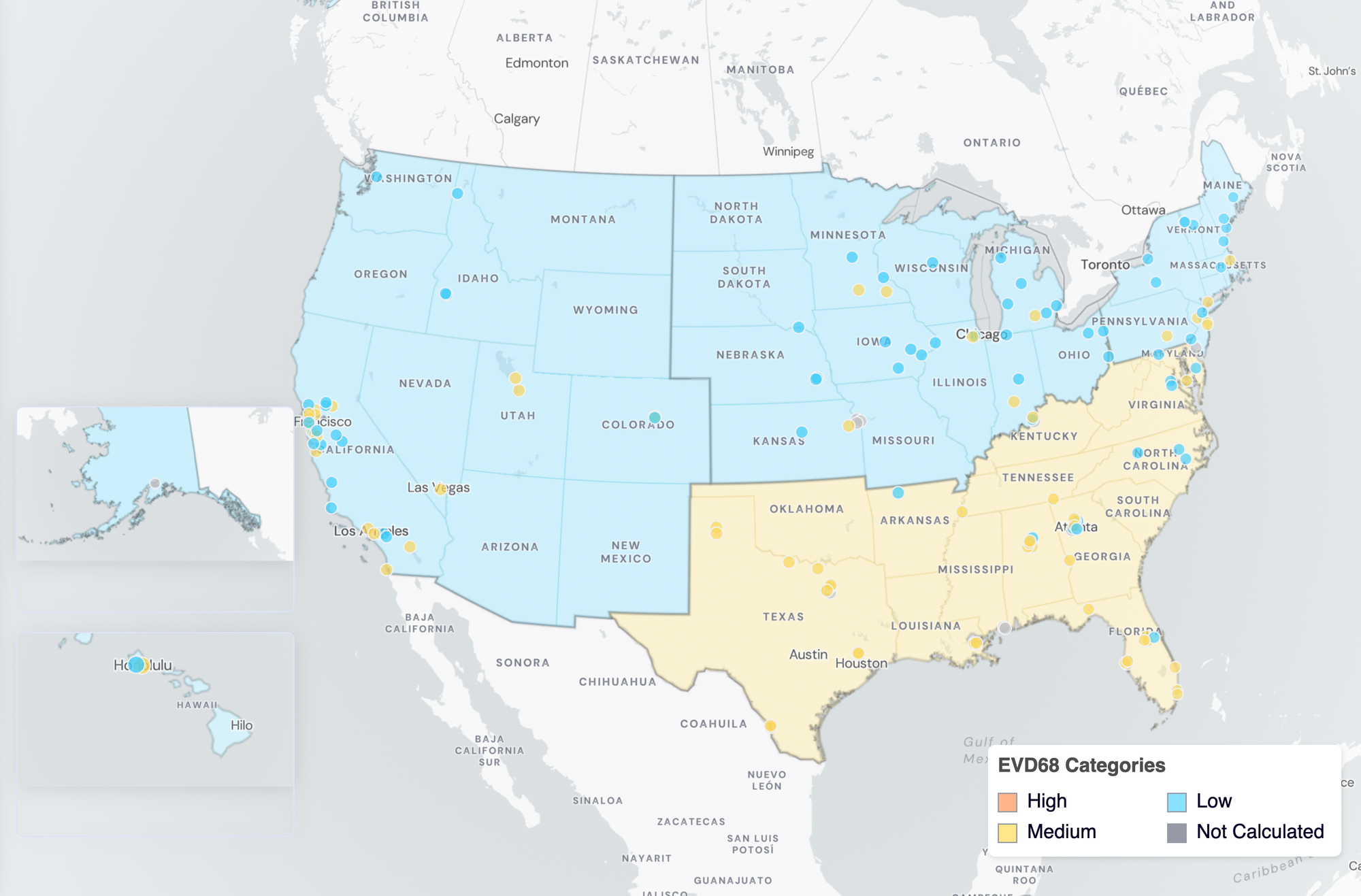 Below are the current EV-D68 wastewater categories for all WWSCAN sites (recall the category is determined by the frequency of detection):