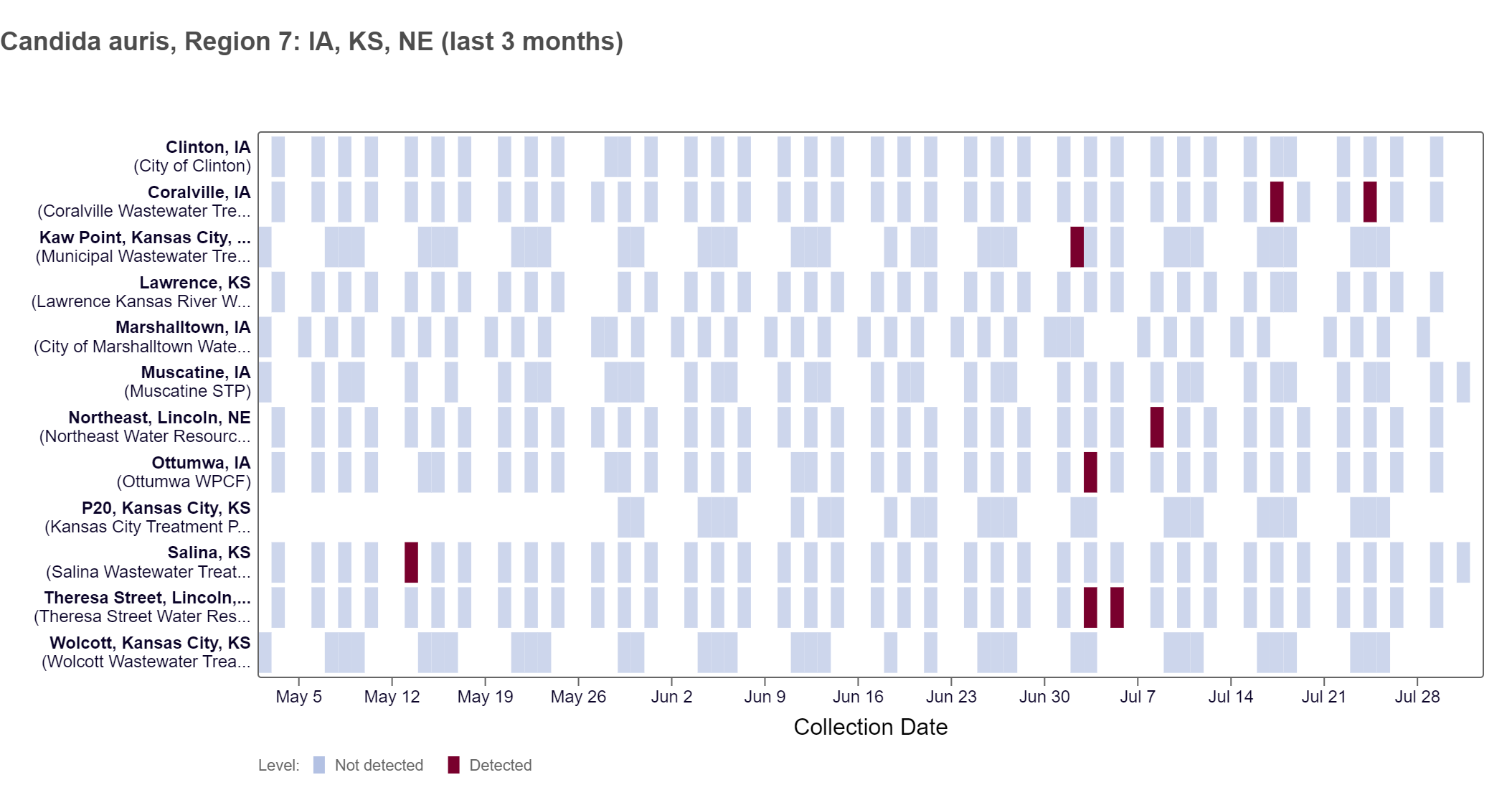 The chart below shows plants in HHS region 7 as rows, and days as columns (labeled at the bottom axis). White indicates no samples, blue is non-detect for C. auris DNA and red is detect for C. auris DNA.