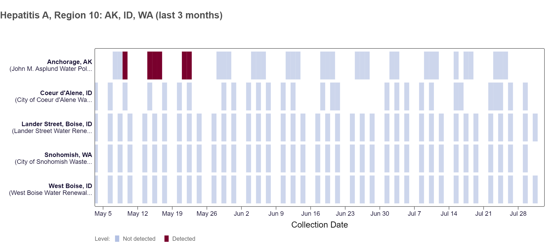 The chart below shows each WWSCAN plant in HHS Region 10 as rows, and days as columns (labeled at the bottom axis). White indicates no samples, blue is a non-detect for Hep A RNA and red is a detection for Hep A RNA.
