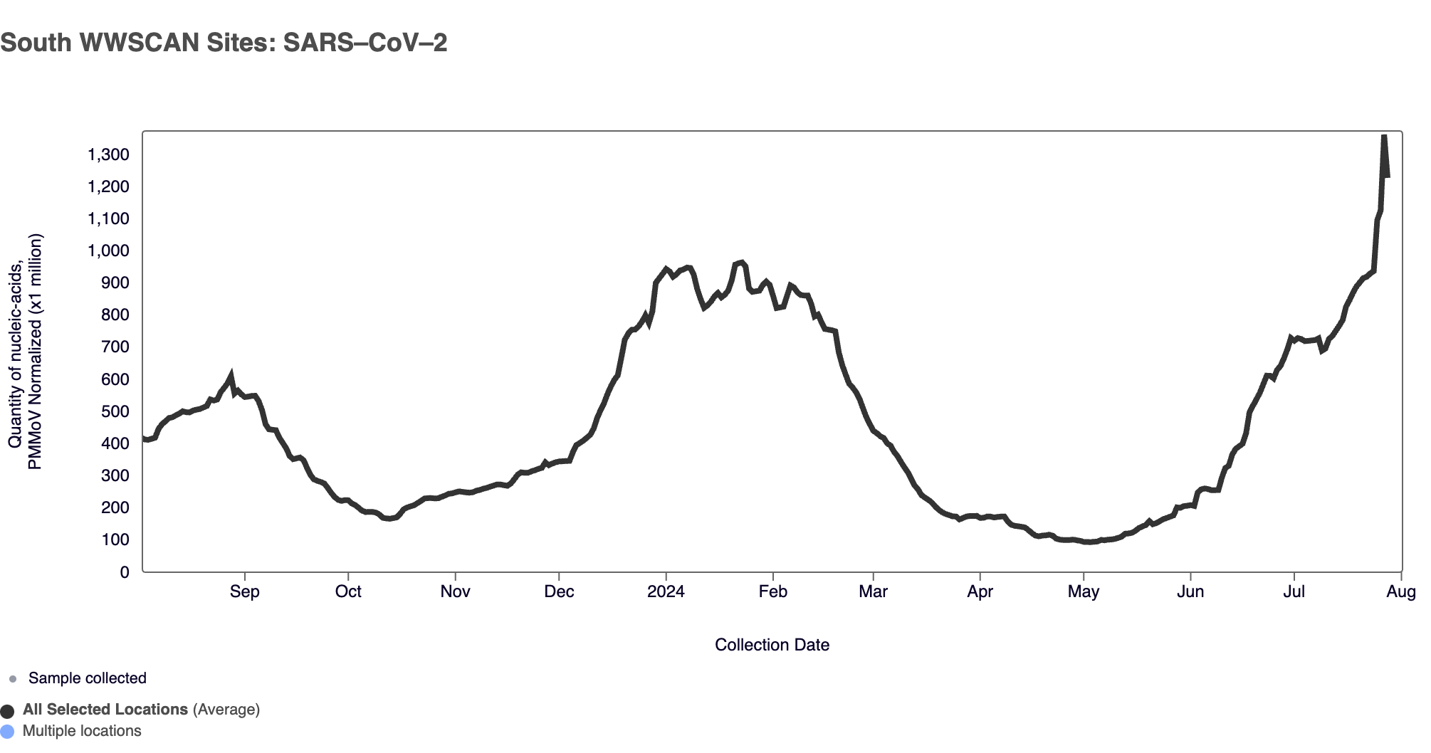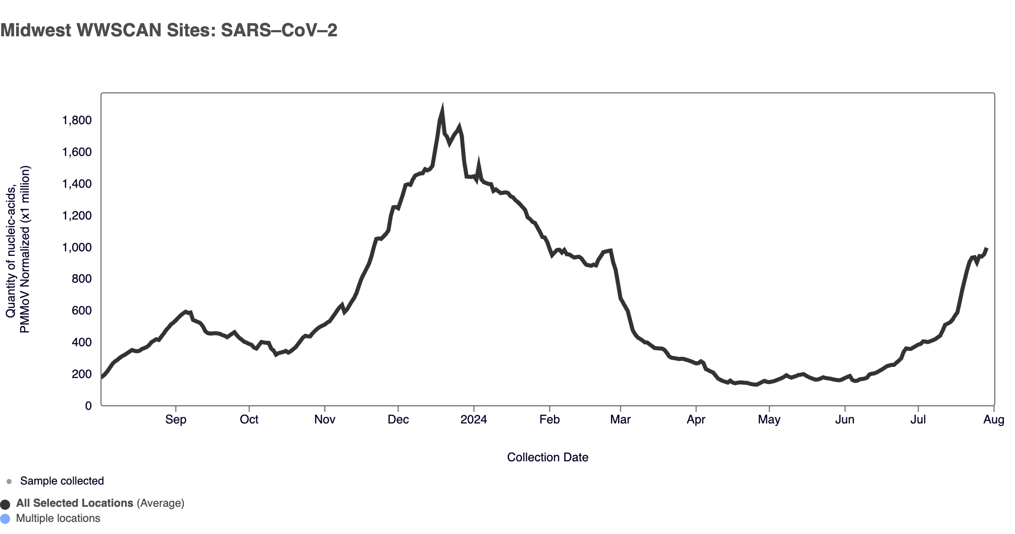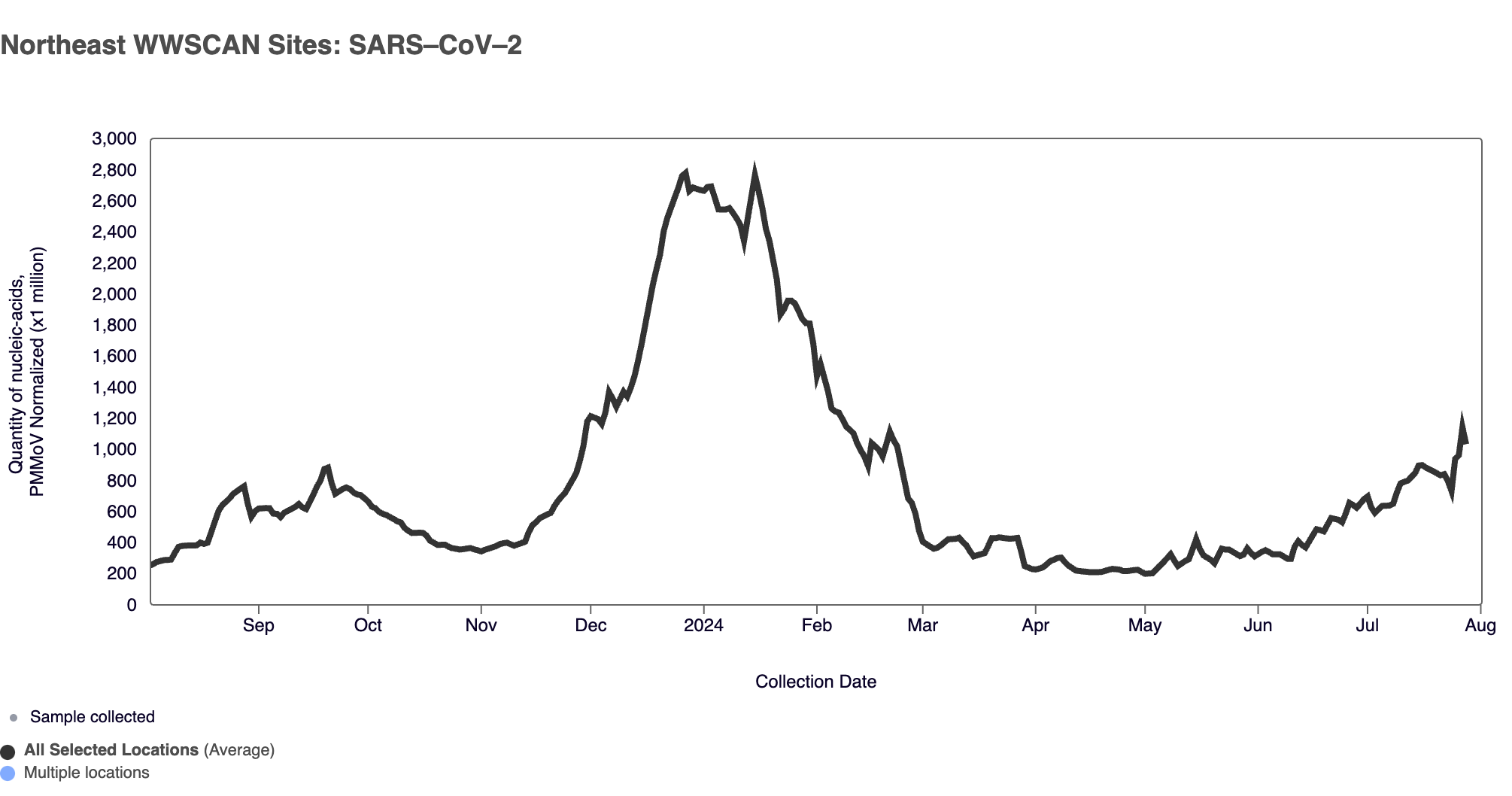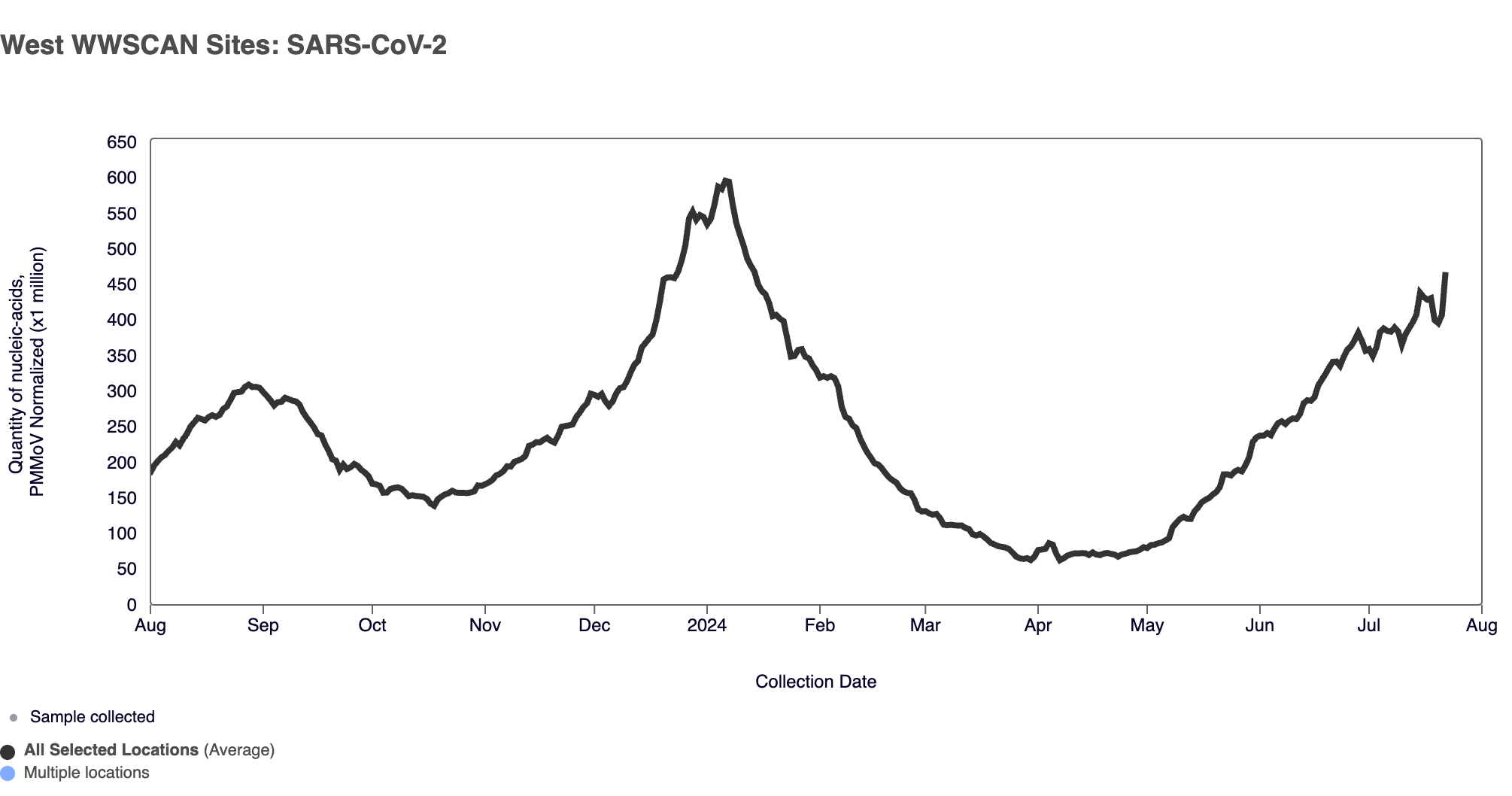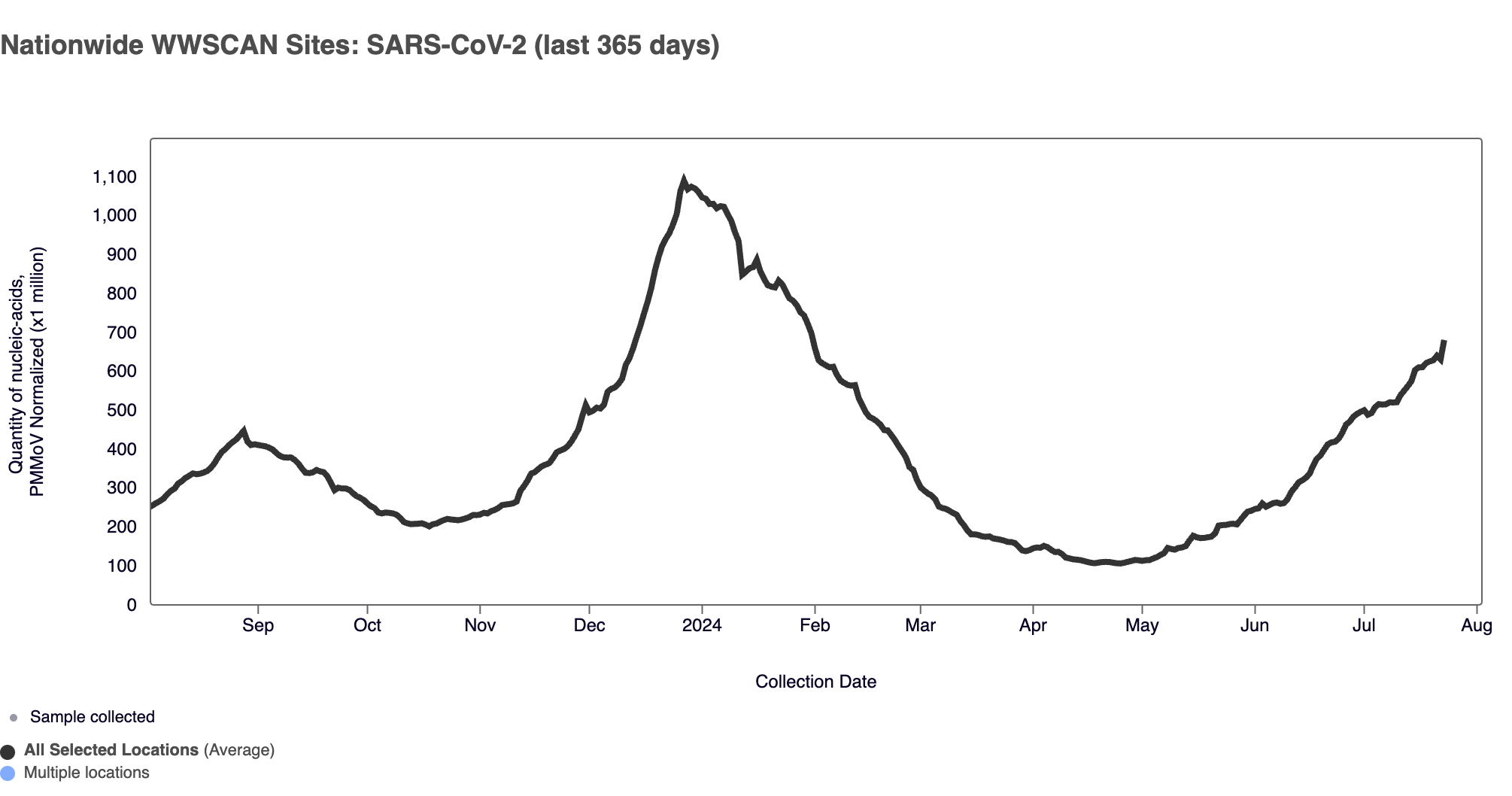 SARS-CoV-2 N gene RNA median concentration across all sites in July 2024 was 93,745 copies/gram. For reference, the median concentration in July 2023 was 41,239 copies/gram. Below is the population weighted average SARS-CoV-2 N gene concentrations (normalized by PMMoV) from all participating WWSCAN sites across the country over the last 365 days.