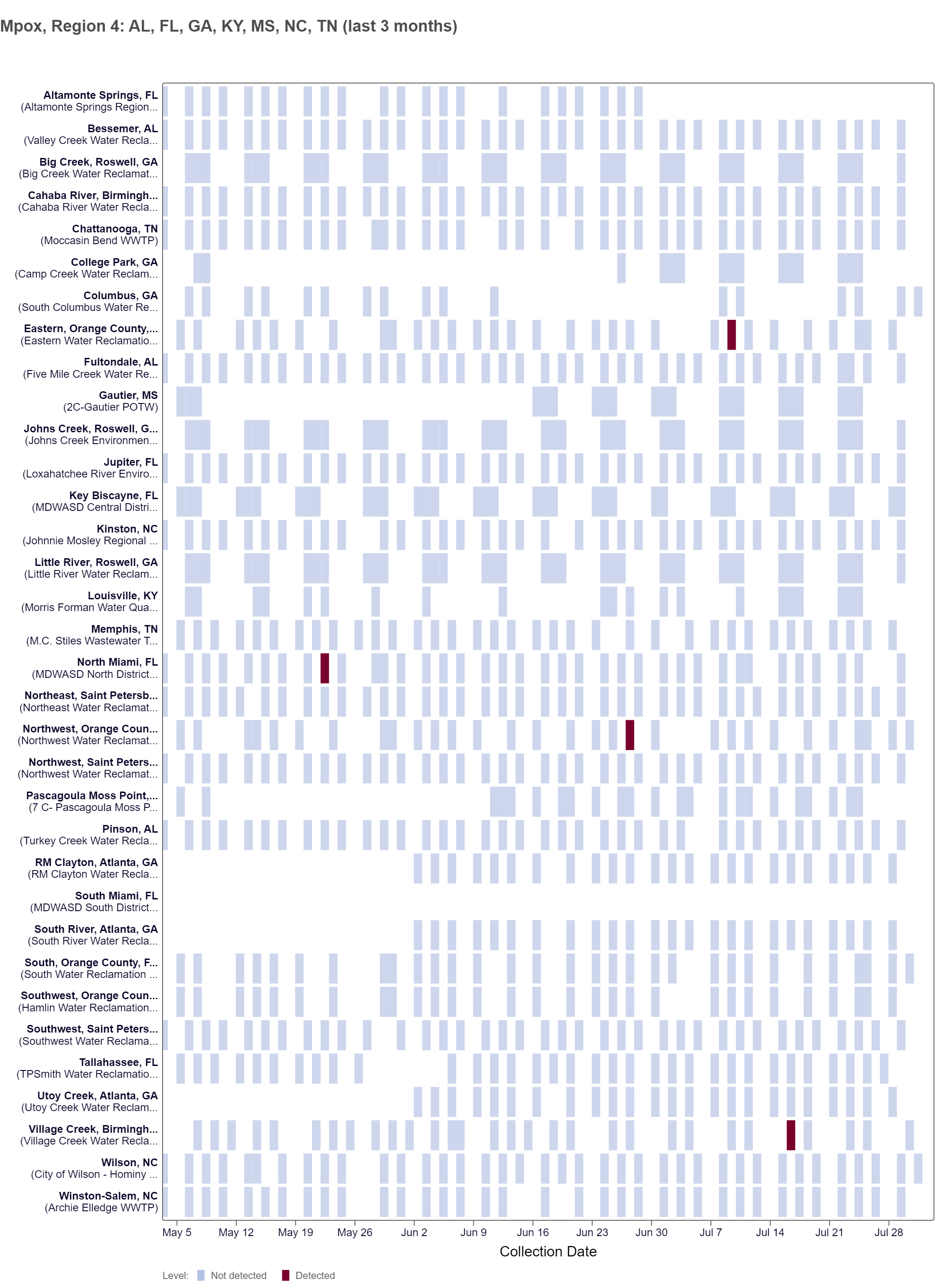 The chart below plants in HHS region 4 as rows, and days as columns (labeled at the bottom axis). White indicates no samples, blue is non-detect for mpox DNA and red is detect for mpox DNA.