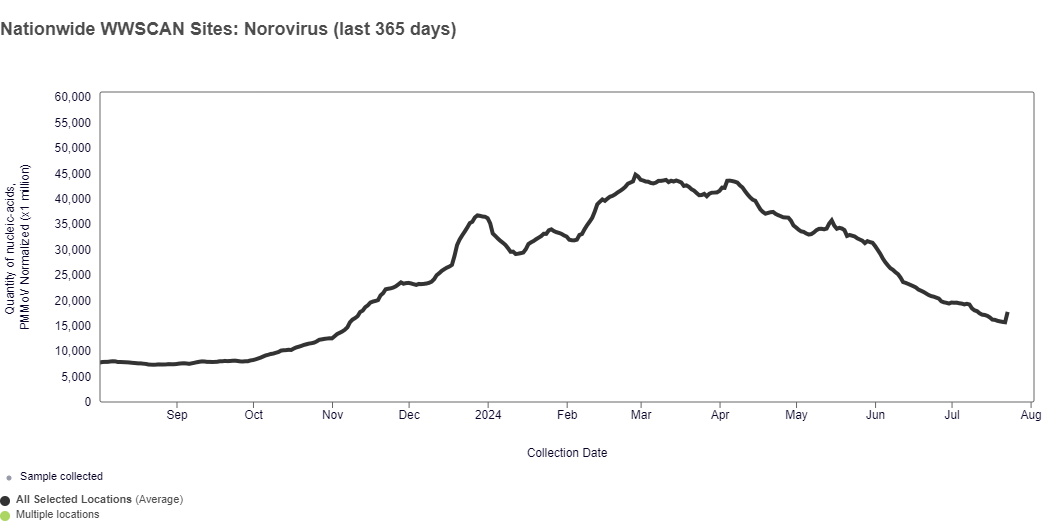 Hepatitis A (Hep A) RNA - We have detected Hep A RNA in 9.5% of samples from all WWSCAN sites in July 2024. Nationally, HepA is in "Low" category due to limited detections.
