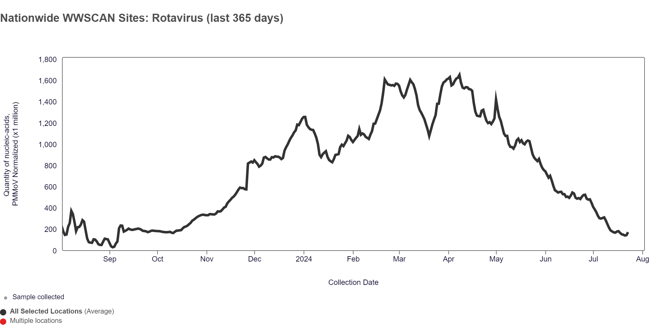 Rotavirus RNA median concentrations across all sites in July 2024 is 96,734 copies/gram. For reference, the median concentration in June 2024 was 104,663 copies/gram. Below are the Rotavirus RNA concentrations (normalized by PMMoV) from all participating WWSCAN sites across the country. The population-weighted average is shown.